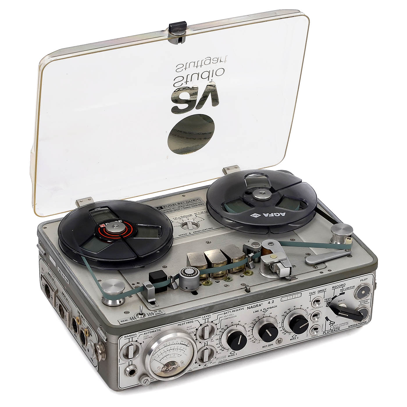Kudelski, Switzerland. Mono-reel tape recorder for battery operation, three speeds: 38, 19 and 9.5 cm/s, coil diameter from 13 to 18 cm, built-in monitoring speaker, Neopilot sync, featuring 2 microphone inputs and a built-in audio limiter, motor running, further electrical functions unchecked. With Perspex cover.