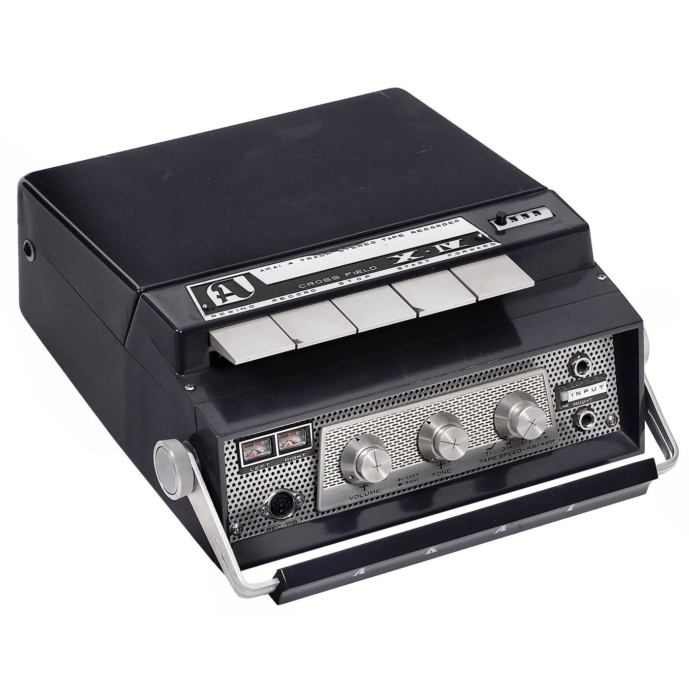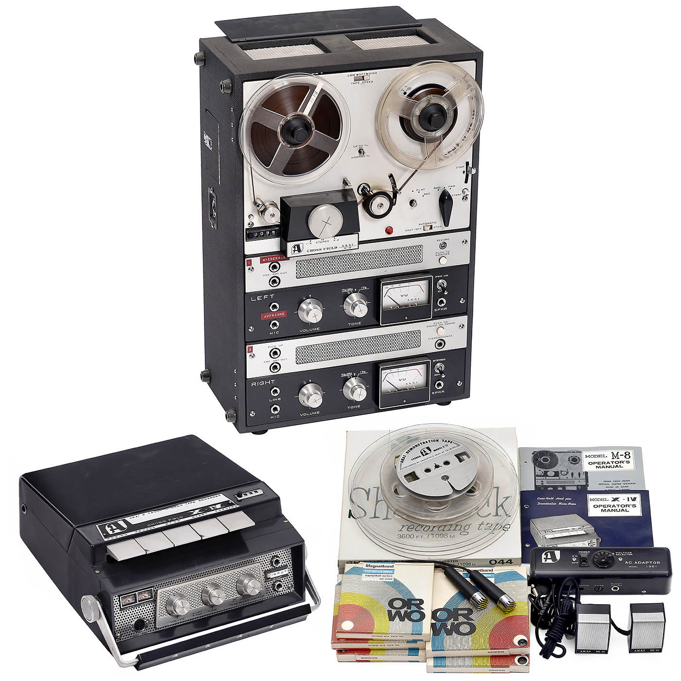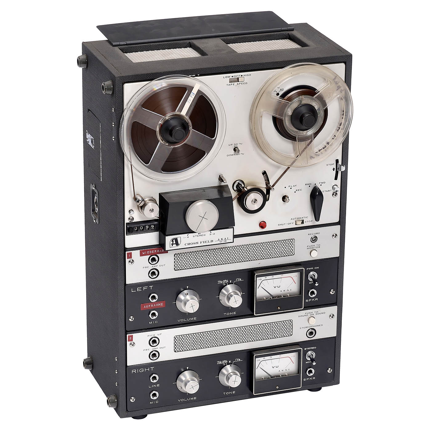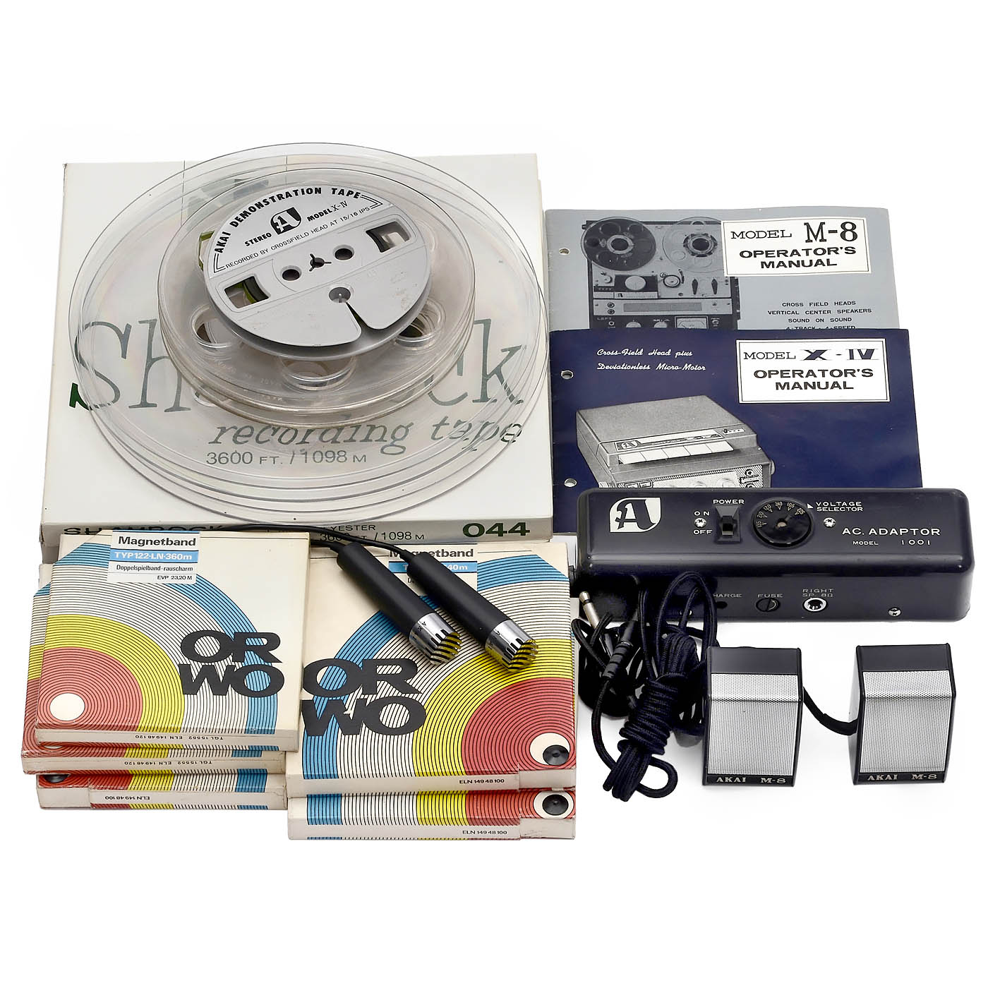 Akai Electric Co., Ltd., Tokyo, Japan. 1) Cross Field X-IV, c. 1965, four-track stereo hi-fi reporter tape recorder, glass ferrite combination head, 4 tape speeds (19, 9.5, 4.7 and 2.4 cm/s), reel diameter max. 13 cm, 2 VU meters, built-in mono amplifier with dynamic speaker, operates on 6V battery or external power supply, all-metal diecast case, with power supply model 1001, stereo microphone ADM-5, 3 reels including Akai demonstration tape and instruction manual. - And: 2) Cross Field M-8, c. 1967, four-track stereo tape recorder, Crossfield sound head system, low-frequency amplifier, 2 built-in speakers, mains 110/220 volts, missing the record switch button, with Akai stereo microphone, manual, 9 reels of varying sizes and extensive other accessories. - Both tape recorders work, however the tape speed runs irregularly.