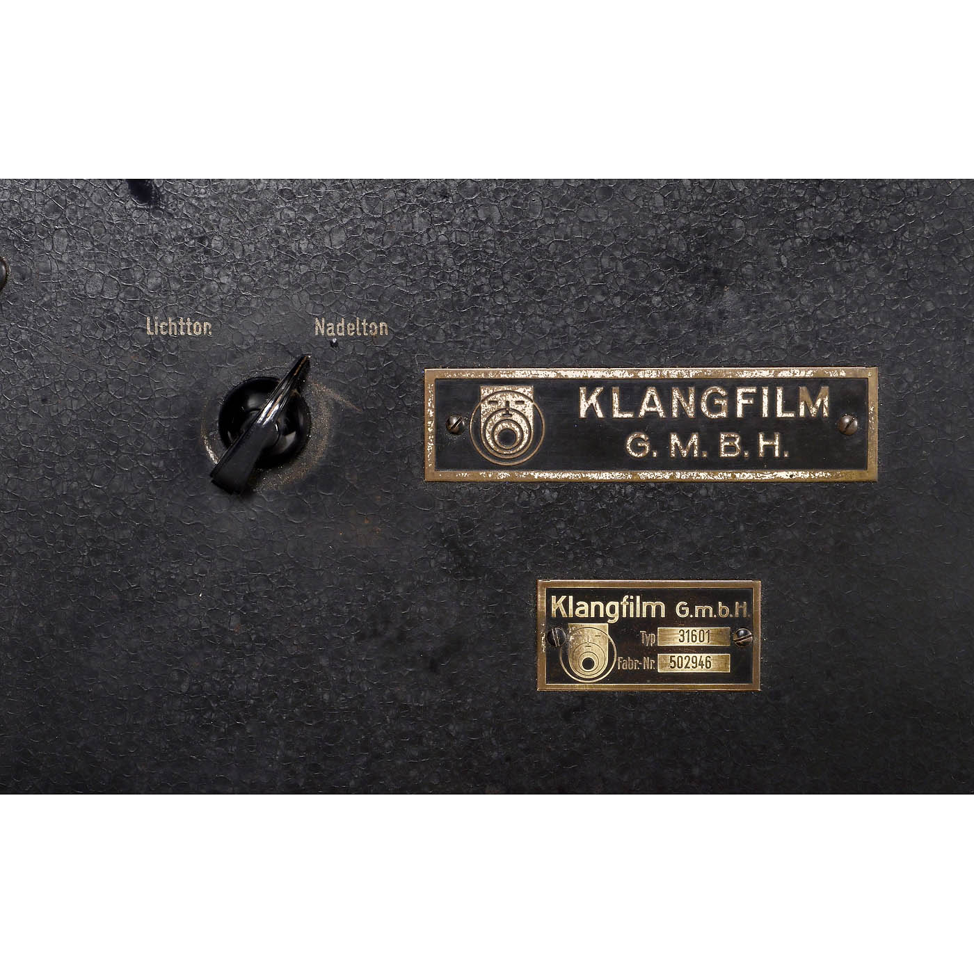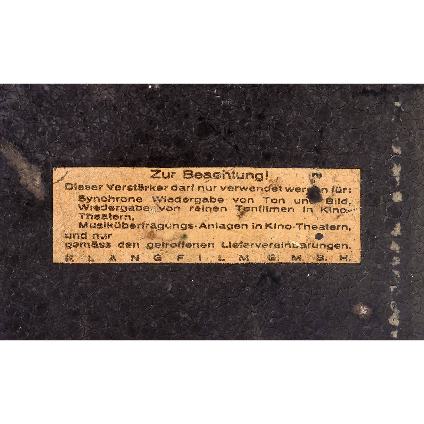 Klangfilm GmbH, Berlin. Amplifier for sound projectors in cinemas, both for the control loudspeaker in the projection room and for the theater auditorium, approx. 20-watt amplifier output, 220-volt mains operation, unmodified original condition, KL70701, 2 x KL70504, KL71403 and KL75301 tubes, electrical functions not tested. - Note: The device can be switched between the light sound and record sound inputs (sound film process from the early years of synchronized sound in film theaters.