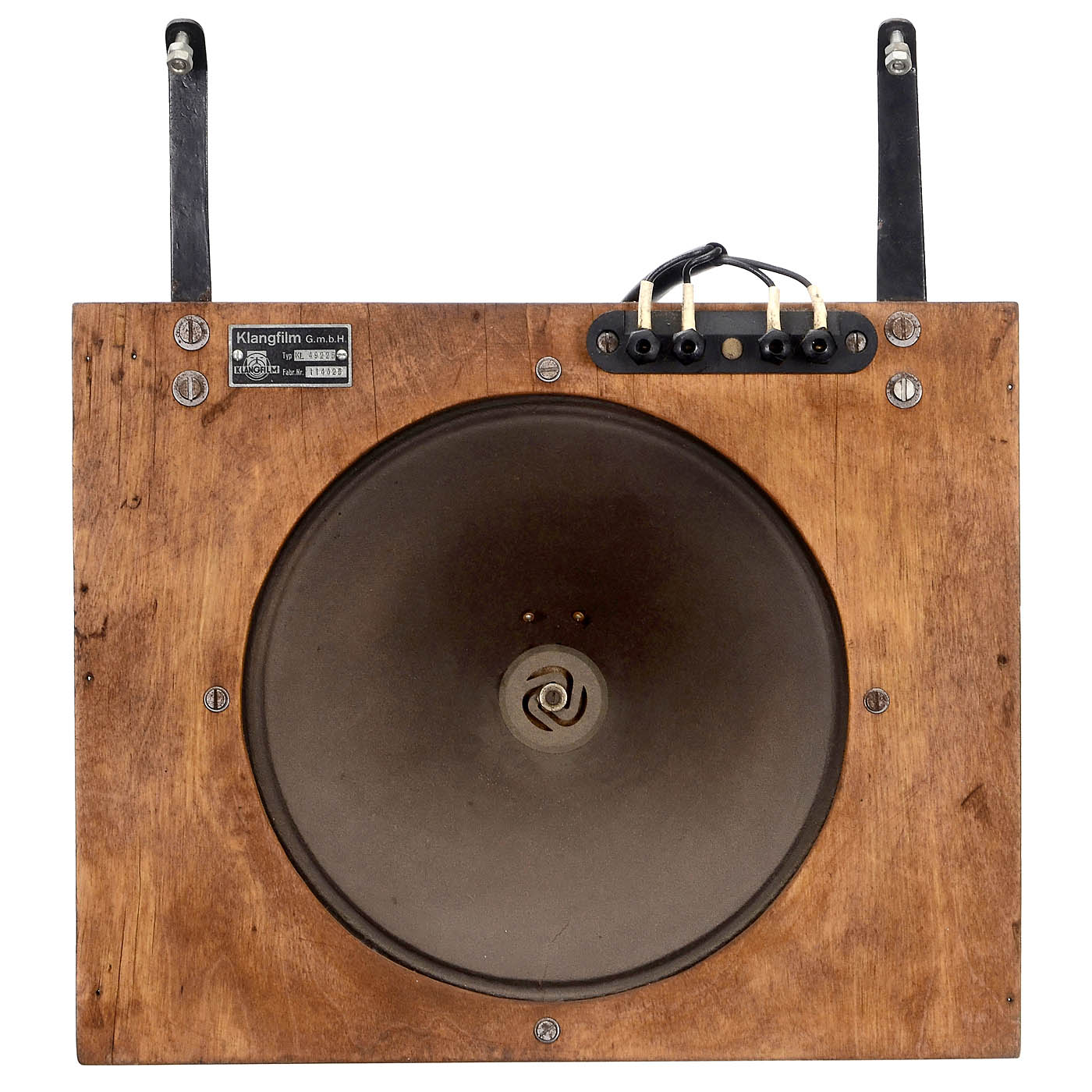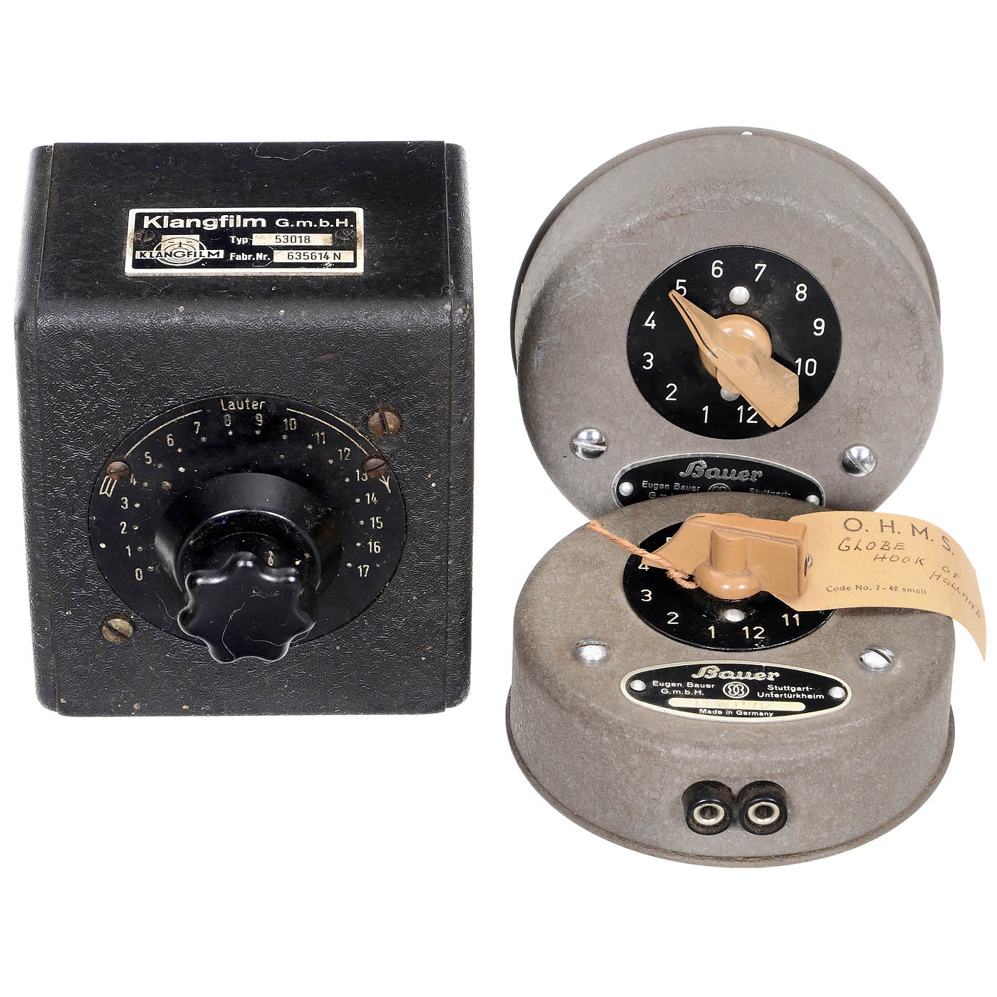 1) Dynamic loudspeaker type KL 49225, c. 1940, 10 watts, 15 ohms, repaired crack in the diaphragm. - 2) Klangfilm cinema volume controller, type 53018. - And: 3) 2 brand-new Eugen Bauer cinema theater volume controllers.