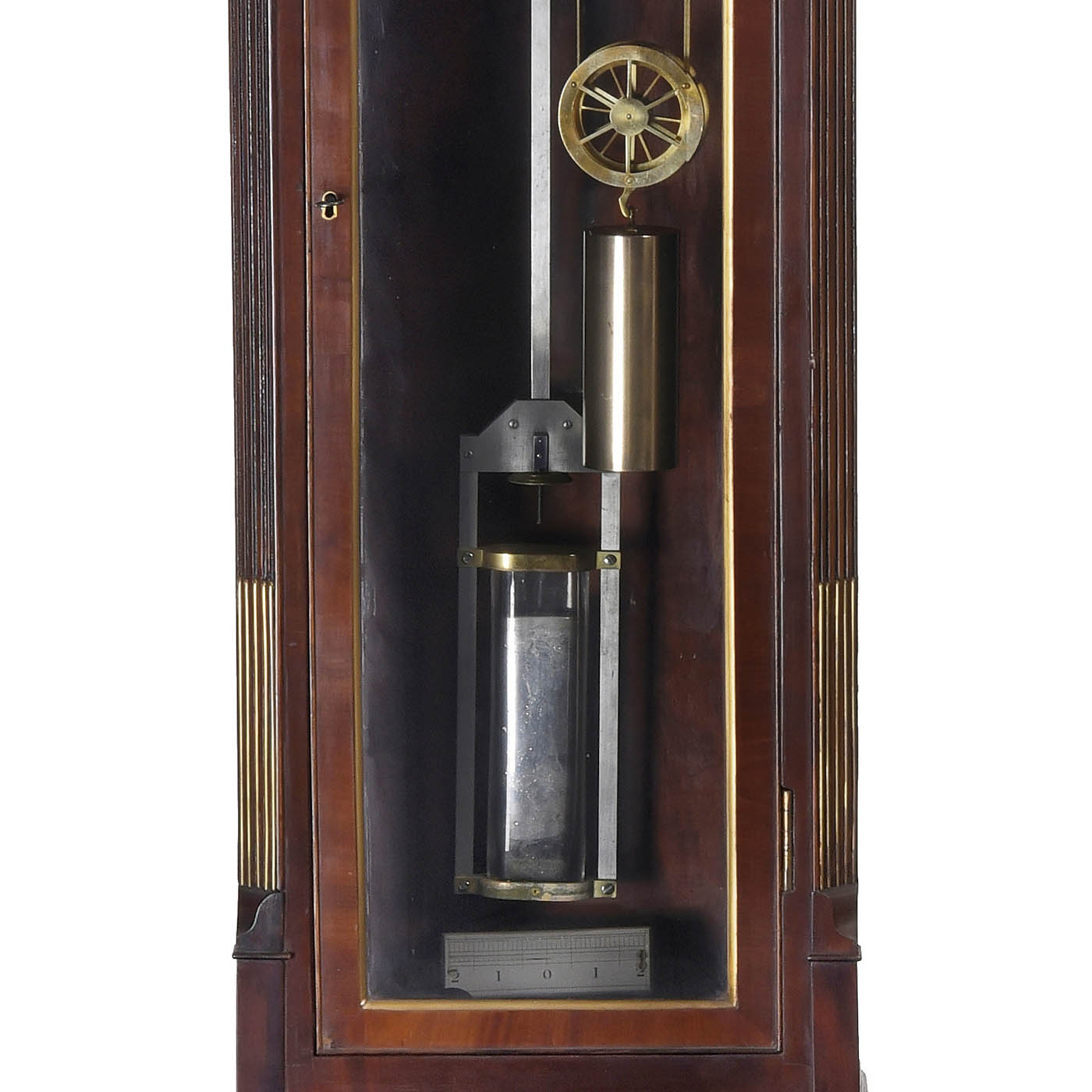 Signed on the dial: "Dwerryhouse & Ogston, Davies Str., London", 10-inch silvered dial with individual dials for the seconds, minutes and hour displays, three blued steel hands, weight-driven six-pillar brass-plate eight-day movement with anchor escapement, fully-enclosed mercury pendulum (mercury is used for temperature compensation) and brass-spoked pulley and weight, in mahogany case with beveled glass front door, 71 in. height, with key, good working condition. - Please note: Collection only, shipping not possible due to mercury pendulum.