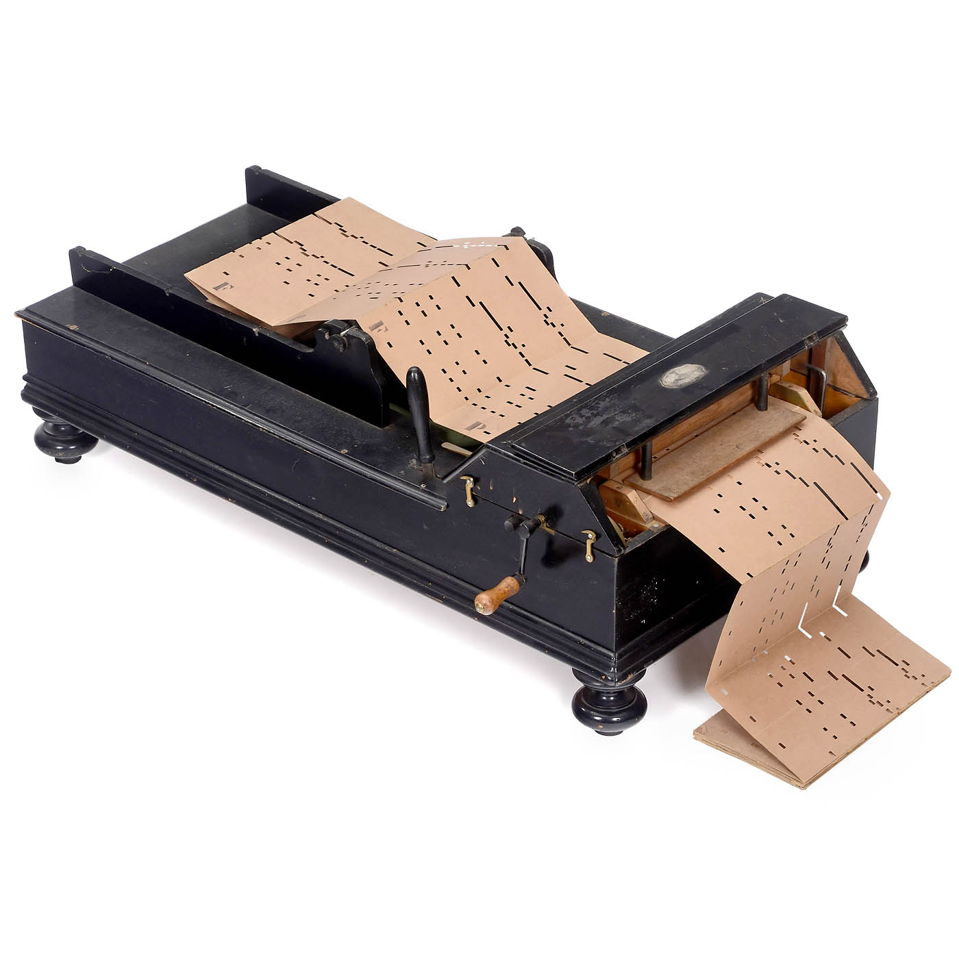 Invented and manufactured by Giovanni Racca, Bologna, Italy, for 12 1/6 in. wide folding card books, hand-turned mechanism, steel strings, expression lever, metal frame, ebonised wood case, overall 40 ½ x 20 ½ x 13 ¾ in., good playing condition, with one book ("La Traviata" by Verdi).