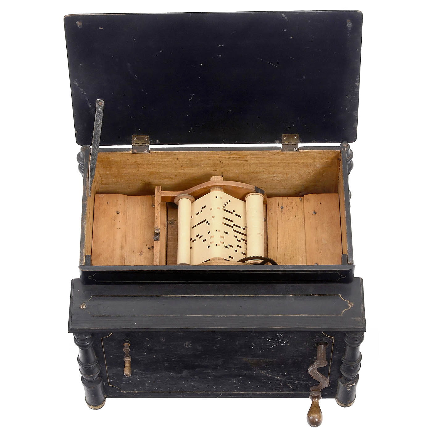 Bruno Geißler, Leipzig, Germany. Model 2, for paper rolls, hand-turned mechanism with twin reeds, small rewind crank, ebonized wood case with two side-mounted swell flaps, original transfer on the front, case with some damage, good playing condition, with 12 partially damaged rolls.