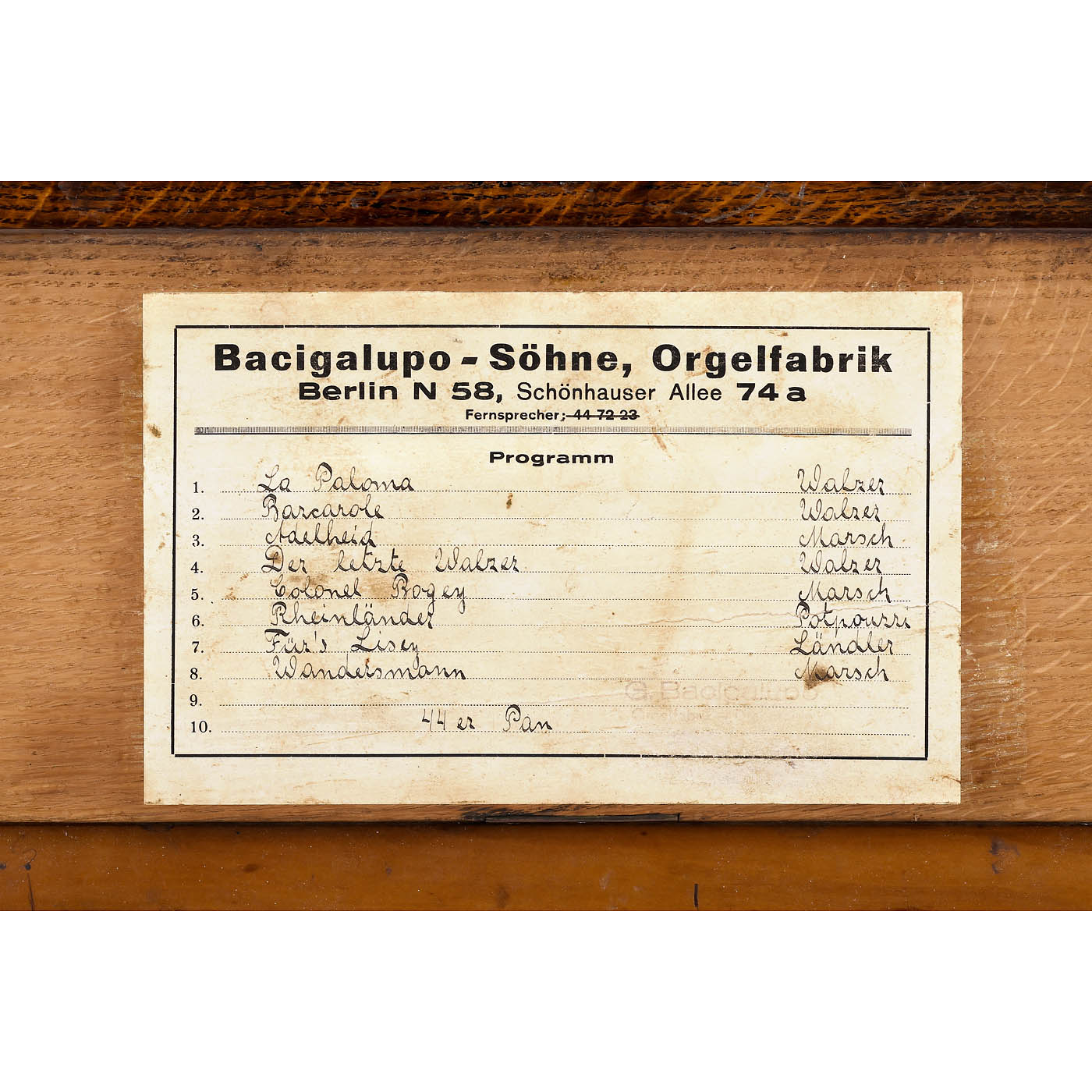 Gebrüder Bruder, Orgelfabrikanten in Waldkirch, Schwarzwald, Germany. With eight-air wood barrel pinned by G. Bacigalupo, 44 keys, 19 visible pan flutes, bass pipes on underside, wood case with tune-sheet in lid, inlaid front and maker’s name, overall 28 1/3 x 13 1/3 x 24 4/5 in., barrel 23 in., playing condition, but 4 notes ciphering, the case is in rare to find original condition.