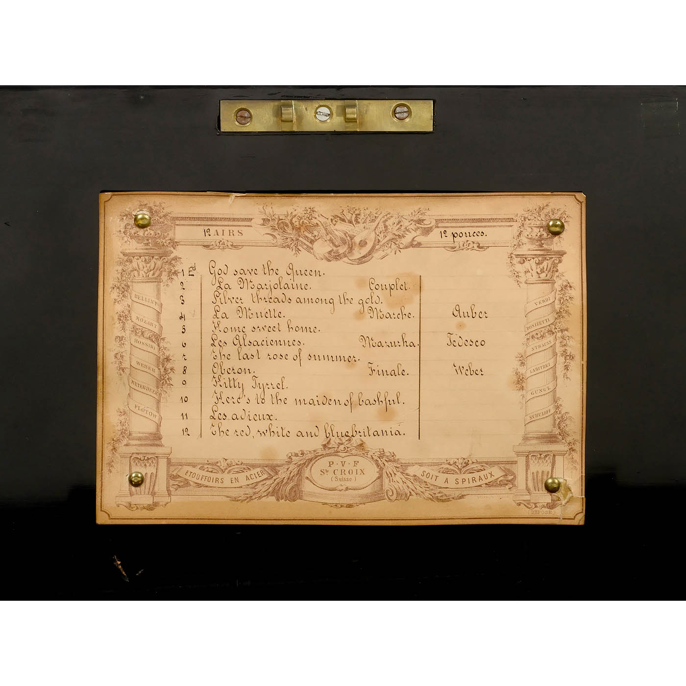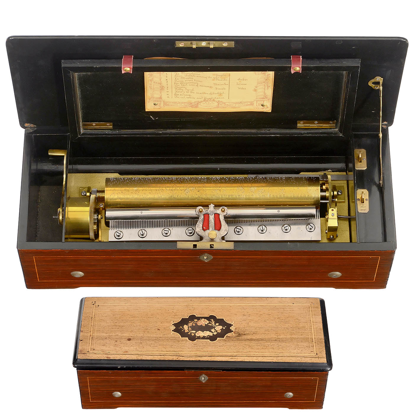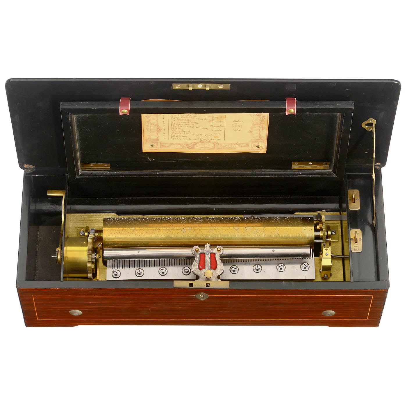 No. 1971, playing twelve popular airs including "God Save the Queen", with 123 alternate sounding and non-sounding teeth in steel comb (extreme bass tooth with defective tip), zither attachment, flat-topped winding lever, tune-change cam with numbered projections, tune-sheet, grained case and faded veneered and inlaid lid, good restored playing condition, with full tone, wd. 22 ¾ in. (58 cm), cylinder 13 in. (33 cm).