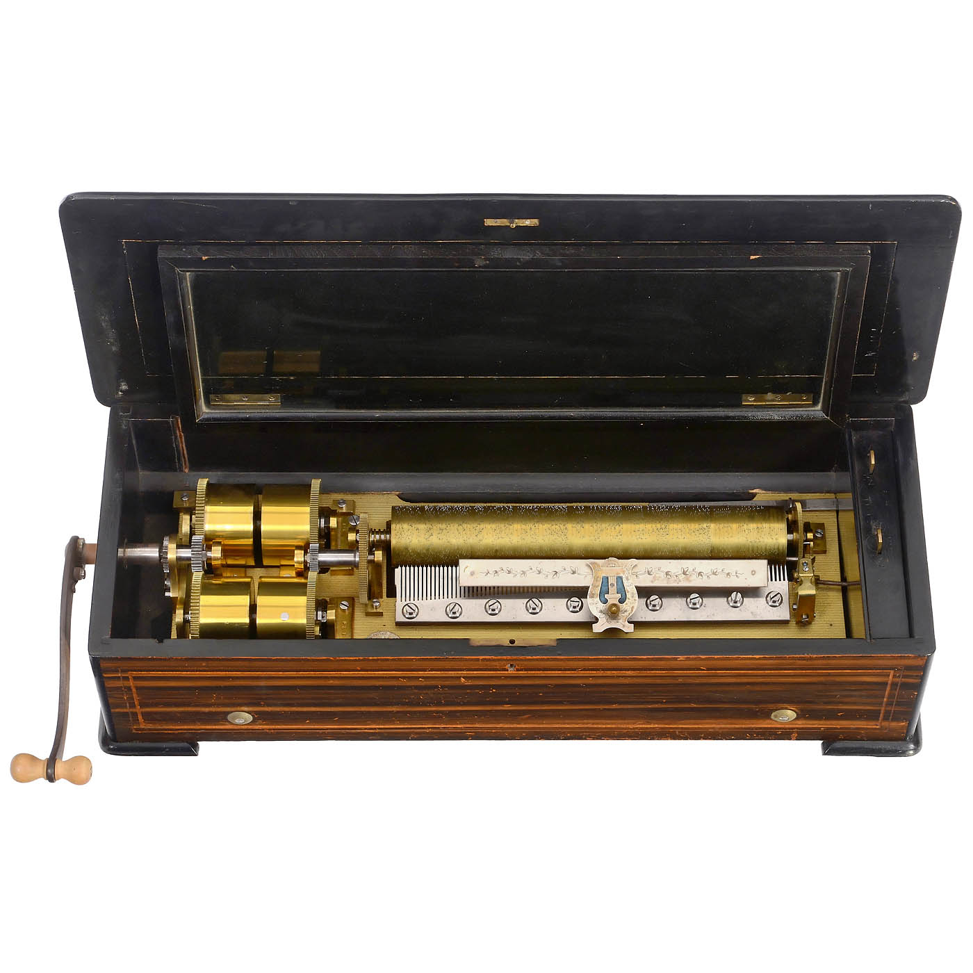 No. 126, playing eight airs, with 93 teeth in comb (complete), quadruple-spring motor with 3-inch (7.5 cm) spoked intermediate wheel, large steel winding ratchet with double-fingered wood grip, plaque with legend "Longue Marche" and patent dates of 16 September 1879 in England and 1 March 1881 in the United States, in grained case with veneered and inlaid lid, wd. 27 ¼ in. (69.5 cm), cylinder 13 in. (33 cm), good playing condition, with full tone.