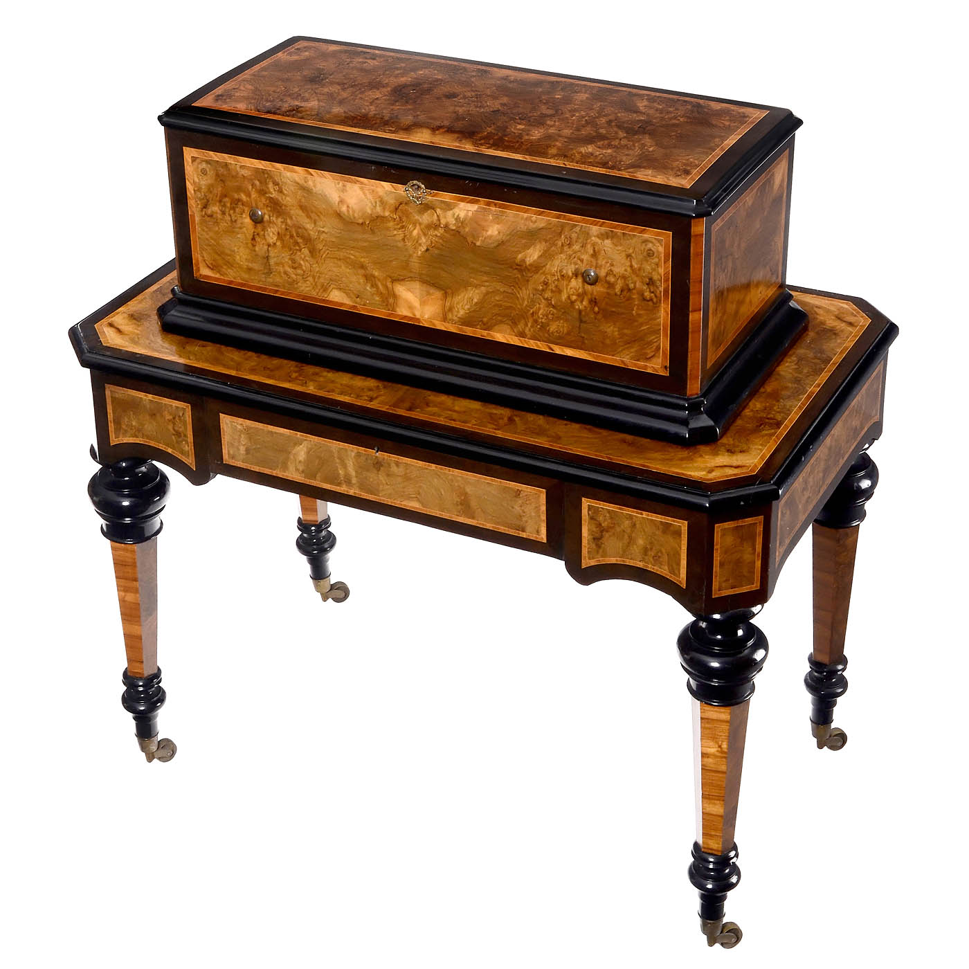 No. 38018, possibly Karrer, with six eight-air cylinders, seventeen-key organ, 55 musical steel teeth and 16 percussion teeth in four combs (approx. 18 tips replaced), optional drum, seven optional engine-turned bells and one dummy with bird strikers, two with bird finials, tune-indicator and tune-sheet, in book-matched walnut-veneered case with kingwood banding and quarter-veneered lid, on matching table with drop-front cylinder-storage drawer, wd. complete 42 ½ in. (108 cm), cylinders 13 in. (33 cm), restored playing condition.