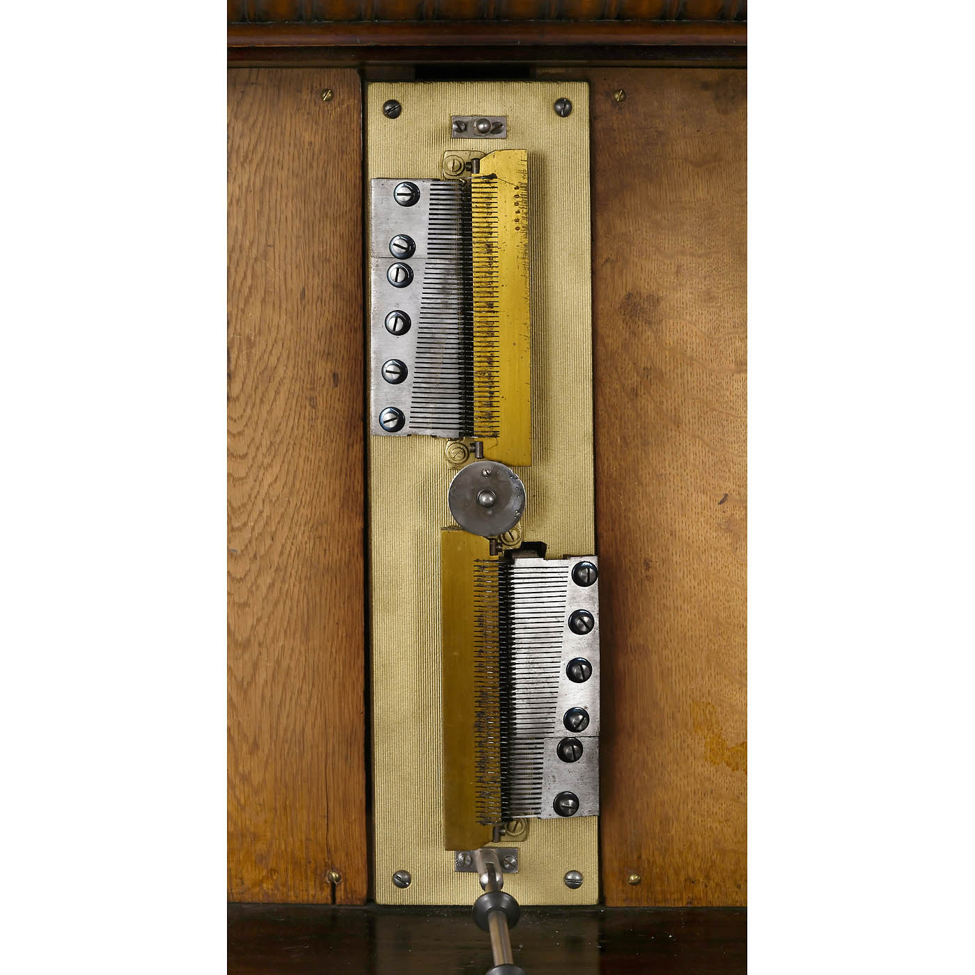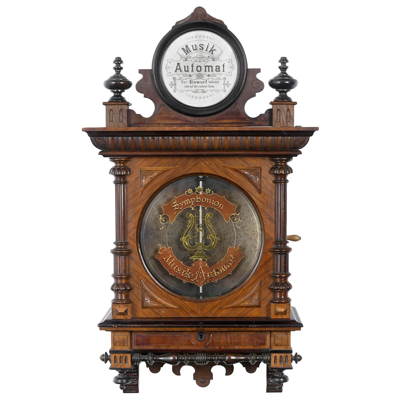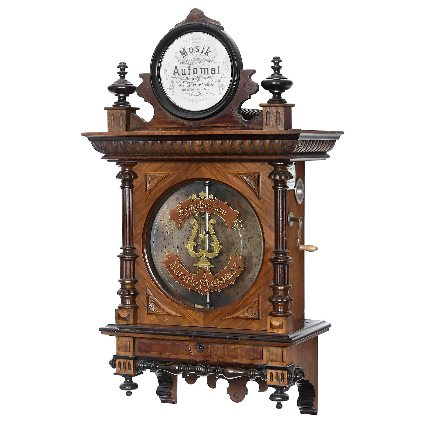 By Symphonion Musikwerke, Leipzig. No. 190180, for Ø 13 5/8 in. discs, sublime harmony piccolo arrangement, 100 teeth in 2 music combs (complete), side-mounted coin-slot, cornice with instructions, door with decorated glass panel and original gilt lettering, walnut case, 25 1/5 x 13 ¾ x 45 3/5 in., very good playing condition, with 23 discs.