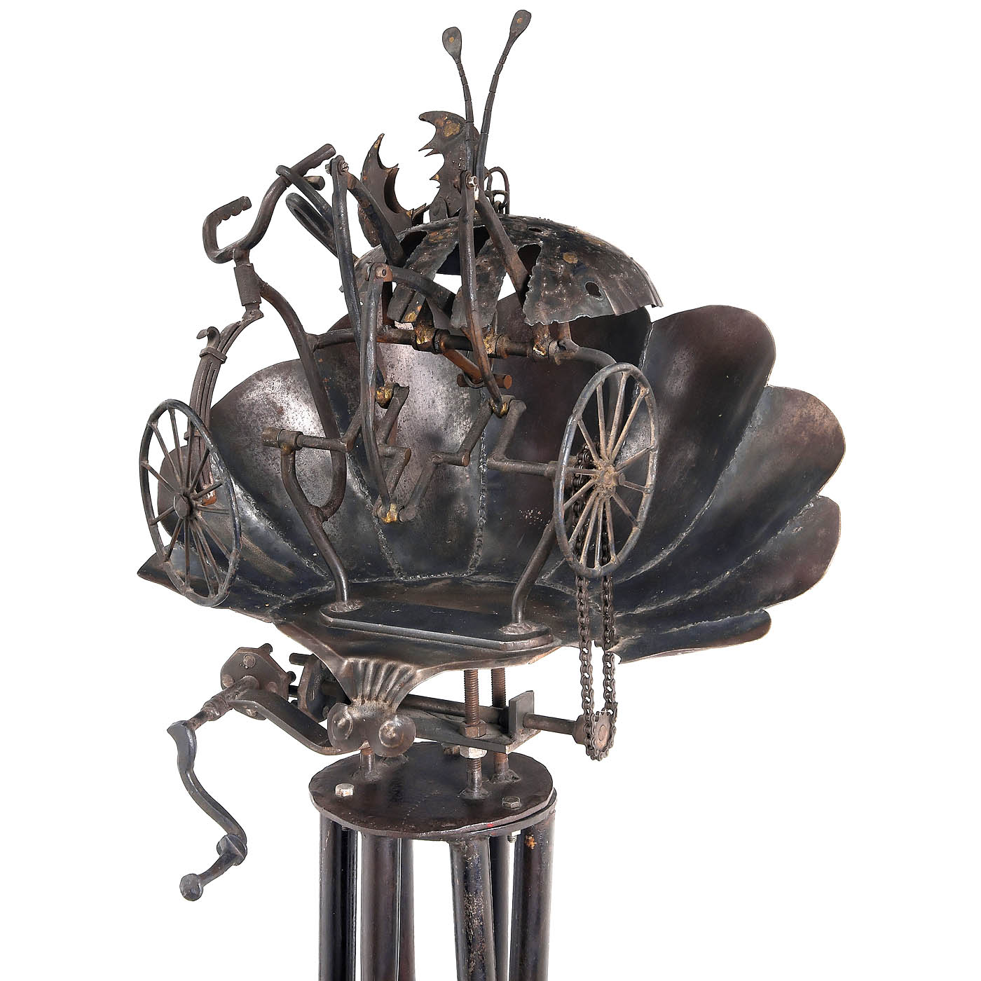 Wrought and brazed steel, depicting an anthropomorphic crustacean on a bicycle, with hand-cranked mechanism operating an axle with chain to the rear wheel and a camshaft for the crab’s three double-jointed legs and hinged claw, on six crab-like legs to base with copper plaque engraved: "Cycling Crab", ht. 53 in. (165 cm), working. - Literature: Andrea Robertson, 1992, "Museum of Automata", p. 78. - Robertson cites Mills: "I started making steel automata at college in 1980 and by 1985 had slowly moved into semi-functional furniture. A delight with making things that work (to nobody’s criteria other than my own), combined with childhood memories of the smells in my Dad’s metal-pressing factory, are probably both contributory factors in my work".