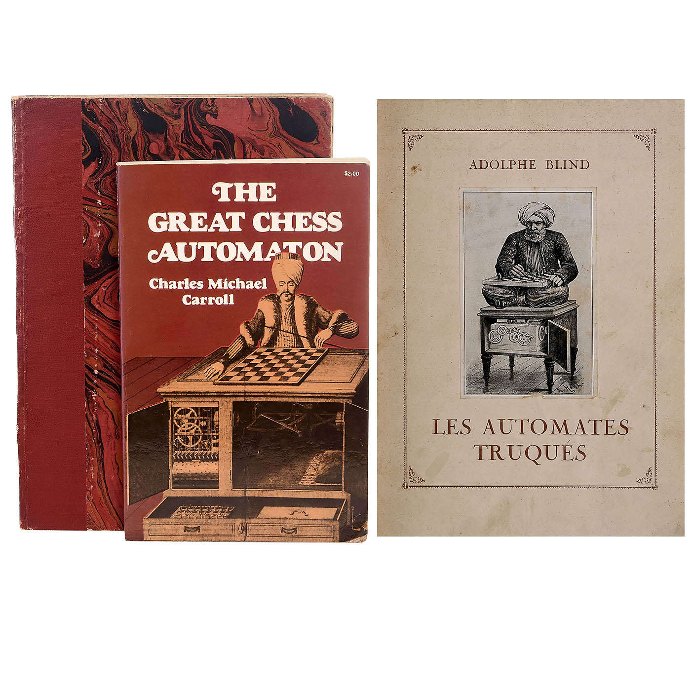 Paris: Bossard, 1927, small 4to, 80 pages, 43 line-drawings and halftone illustrations, frontispiece (creased, lightly soiled) with laid down images of Kempelen’s automaton chess player, preface by Alfred Chapuis, marbled paper covers and cloth-backed spine, some wear to covers, overall good. - Note: Amongst the famous trick automata discussed in the work are Robert Houdin’s orange tree and harlequin, von Kempelen’s chess player and Maskelyne’s 'Psycho'. - In addition: Charles Michael Carroll, "The Great Chess Automaton", 1975.