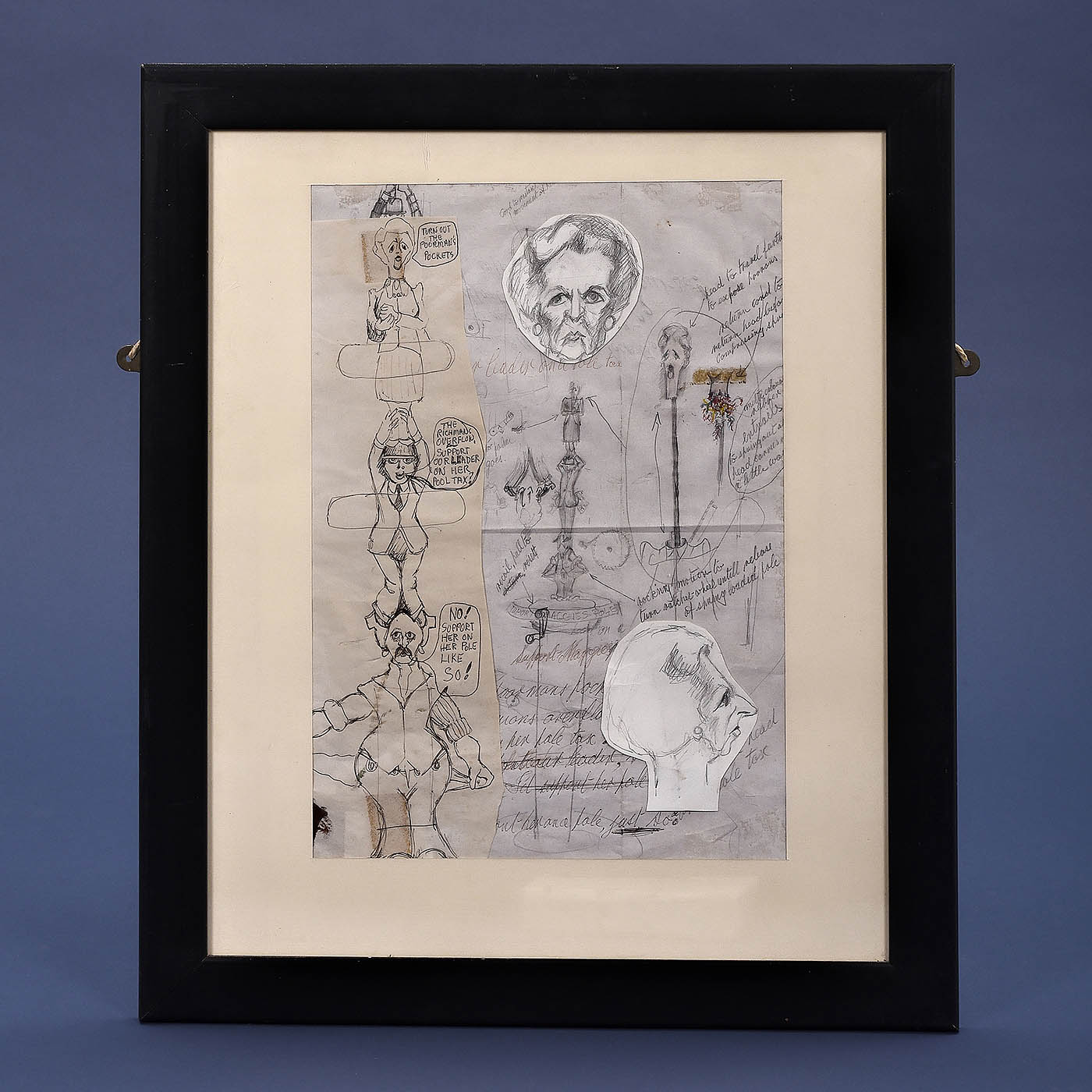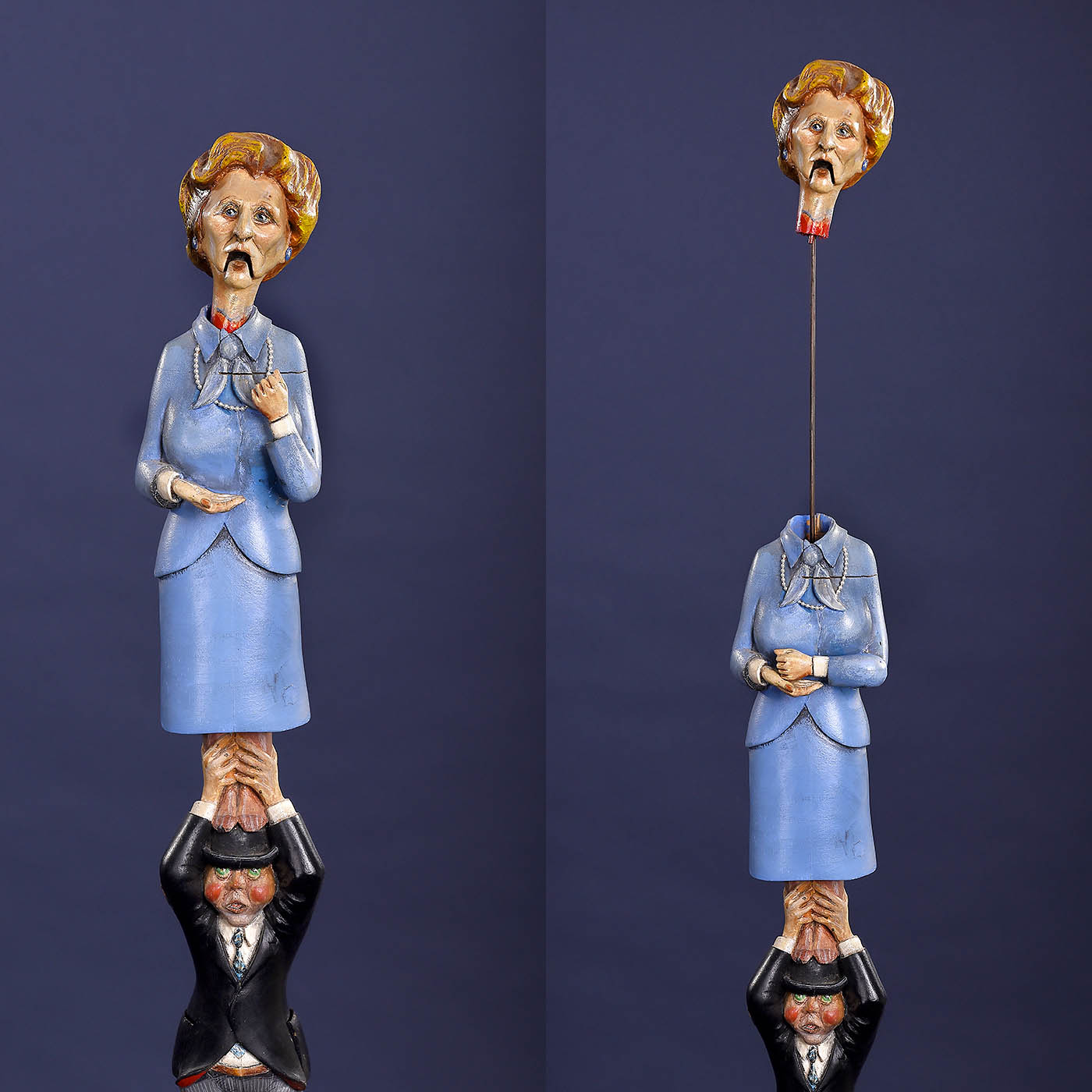 Carved and painted wood trio depicting a poor man with empty pockets balancing a rich man on his shoulders, at the top of the pyramid Margaret Thatcher standing barefoot on the rich man’s bowler hat, with button or coin-activated electric motor, on pedestal with simulated brick covering and printed verse: "Turn out the poor man’s pockets, the rich man’s overflow, support our leader on her poll tax? No! Support her head on a pole like so!", combined ht. of figures 37 in. (94 cm), total ht. 75 in. (195 cm), split in wood on Thatcher’s shoulder, working, with European plug, a safety check of electrical functions strongly recommended. Included is a framed montage of Nelson’s working sketches. - Note: The poor man moves his arms in and out to display his empty pockets, the rich man’s pockets open to reveal his overflowing wealth (pocket movement inactive) while Thatcher beats her fist until, with a look of horror, her severed head rises on a pole. - When the British Conservative government under Margaret Thatcher announced its green paper on poll tax in 1986, Nelson was living in a cottage with rates of less than £ 100 a year. The legislation would create a 650 % tax increase for him overnight. He comments: "So we have Maggie, who supports herself on the rich man, who supports himself by sticking his Guccis into the poor man’s ears". - The automaton offered here was one of two on display at the Museum of Automata in York. - References: The Music Box, MBSGB, Vol. 14, No. 6 (Summer 1990), pp. 159-162; Frank Nelson, "Rude Mechanicals, a Moving Experience", please see: https://www.youtube.com/watch?v=dVLrzu95IaI.