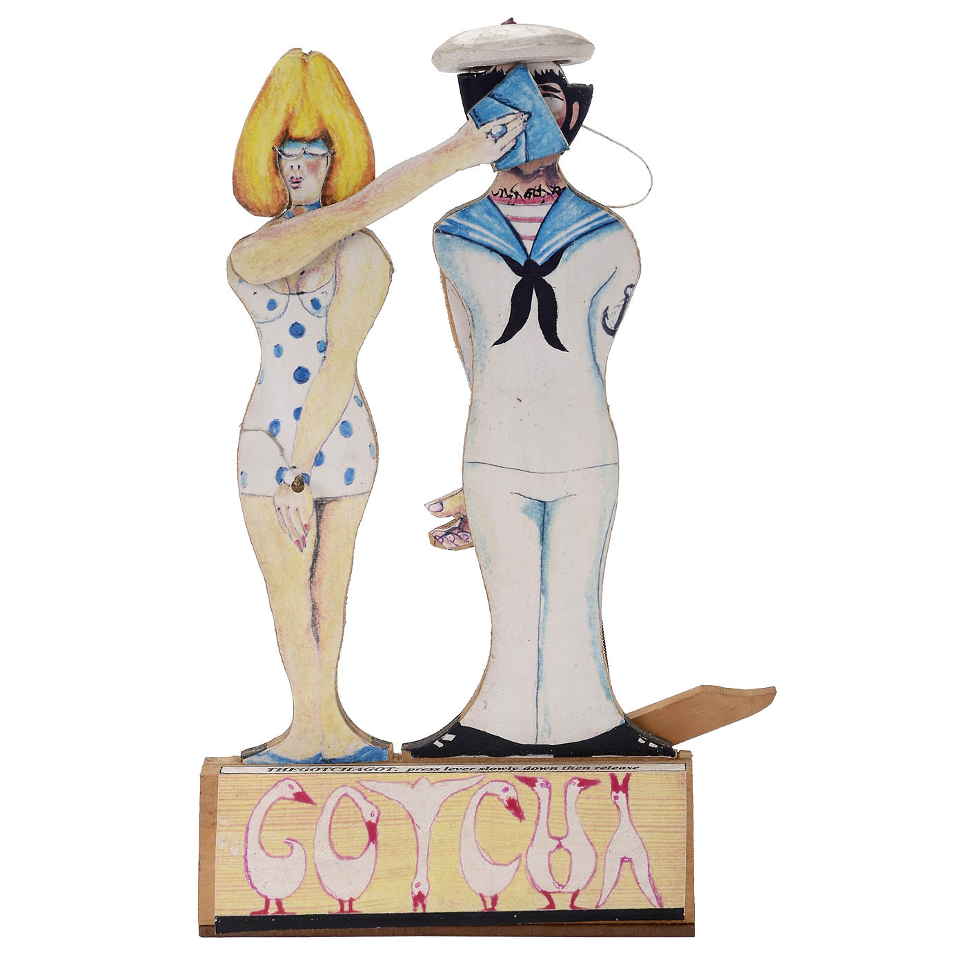 Paper-covered wood figures depicting a sailor and a woman in a bathing suit, with spring-loaded lever-mechanism, the reverse signed "Frank Nelson", ht. 9 ½ in. (24 cm). - The sailor reaches out to pinch his companion surreptitiously from behind, her hair and her eyebrows rise in astonishment, her right arm shoots out and she knocks the hat from the sailor’s head with her handbag - gotcha! - Note: Frank Nelson (1930-2012), artist and automaton-maker. Nelson attended the Blackpool Art School from 1944-1947. His distinctive automata of carved and painted wood were influenced by his childhood in Blackpool, a love of art and engineering and "flavoured by life’s kicks and kisses". - References: Andrea Robertson, "Museum of Automata", 1992, p. 78; Frank Nelson, "Rude Mechani- cals", a Moving Experience", please see https://www.youtube.com/watch?v=dVLrzu95IaI.