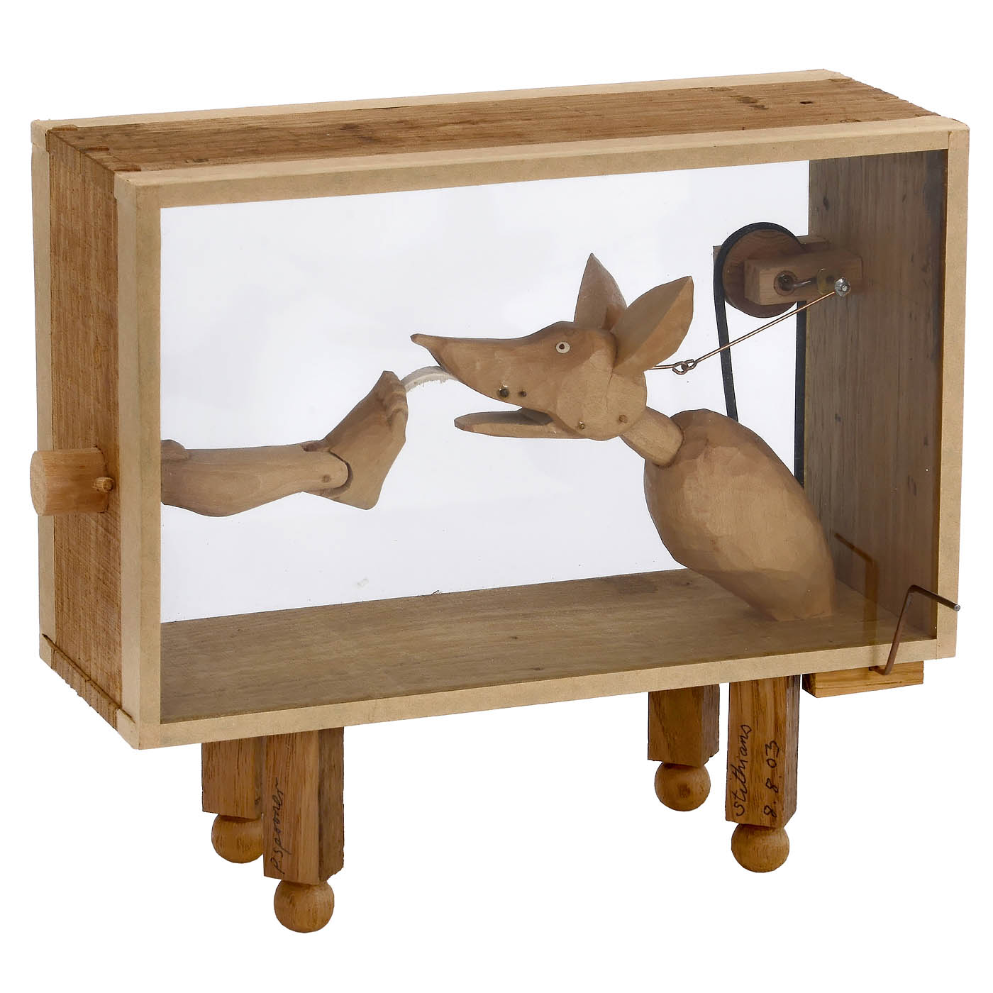 Glazed case displaying a carved wood dog with articulated head and long leather tongue and a naked human foot with articulated ankle, the smooth hand-turned mechanism with visible pulley, cam and linkages causing the dog to raise his head and lick his owner’s foot, with ink signature "P. Spooner", date "Stithians, 8.8.03" and dedication from the artist, ht. 7 ¼ x 8 in. (18 x 20 cm). - A unique Spooner automaton.