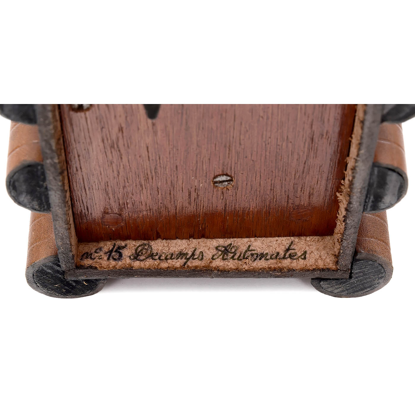 No. 15 of 40, limited edition for the bicentennial of the storming of the Bastille, with vintage celluloid doll dancing atop leather-covered fortress, ink inscription on the underside, activated by single-air movement playing "La Carmagnole", ht. 8 ¼ in. (21 cm), working. - In addition: The original invoice (14.08.1989) from "Automates Publiciataires Decamps 17-19 Place Amalot, 75011 Paris". - An interesting small automaton from the final years of Decamps production.