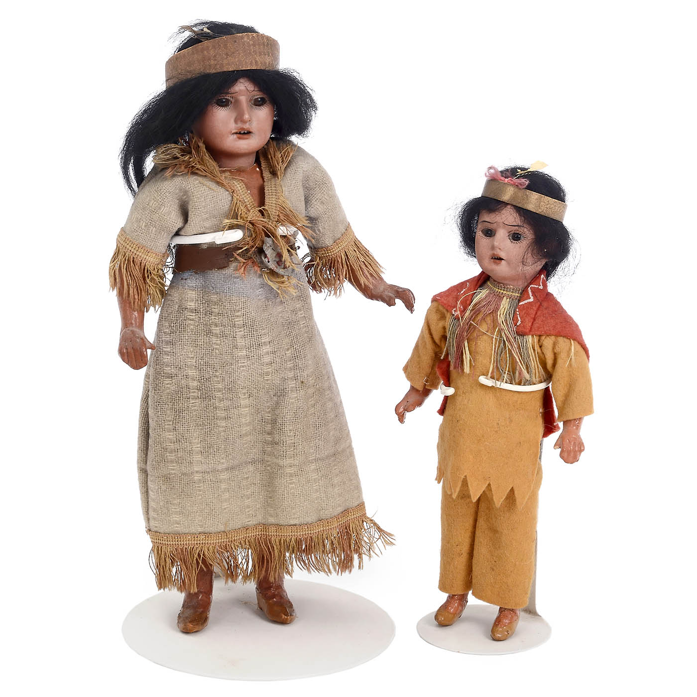 1) Armand Marseille, incised "A.M., Germany, 4/o", modeled with furrowed brow, open mouth, fixed brown glass eyes, original black mohair wig, five-piece brown composition body with molded shoes and contemporary fringed wool costume with handwritten label: "Maria, Canadien", ht. 11 ¼ in. (28.5 cm). - And: 2) Christian Eichhorn & Söhne, incised "C.E. & S, 8/0", with open mouth, fixed brown eyes, original mohair wig, five-piece brown composition body, molded shoes and original felt costume, ht. 8 ¾ in. (22 cm).