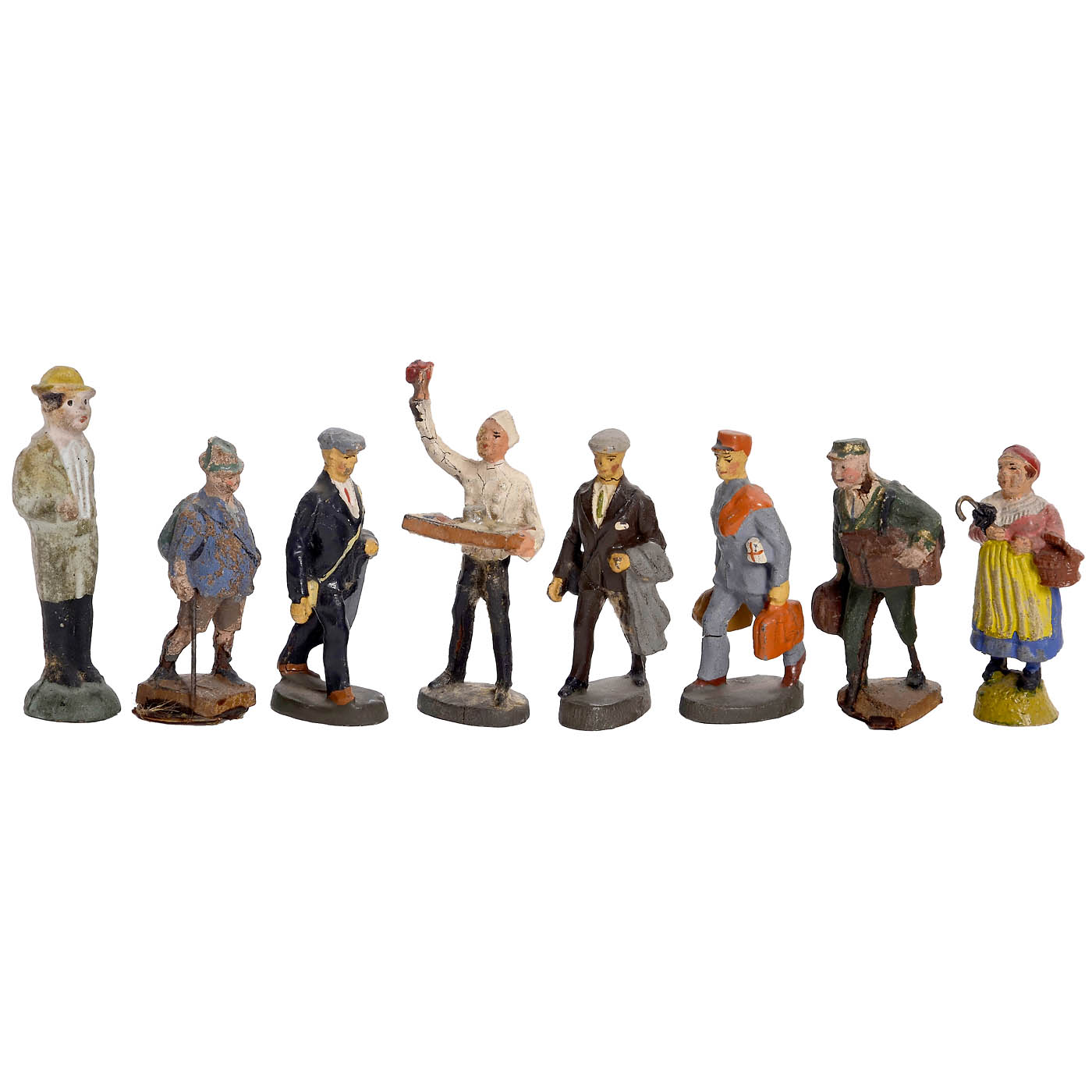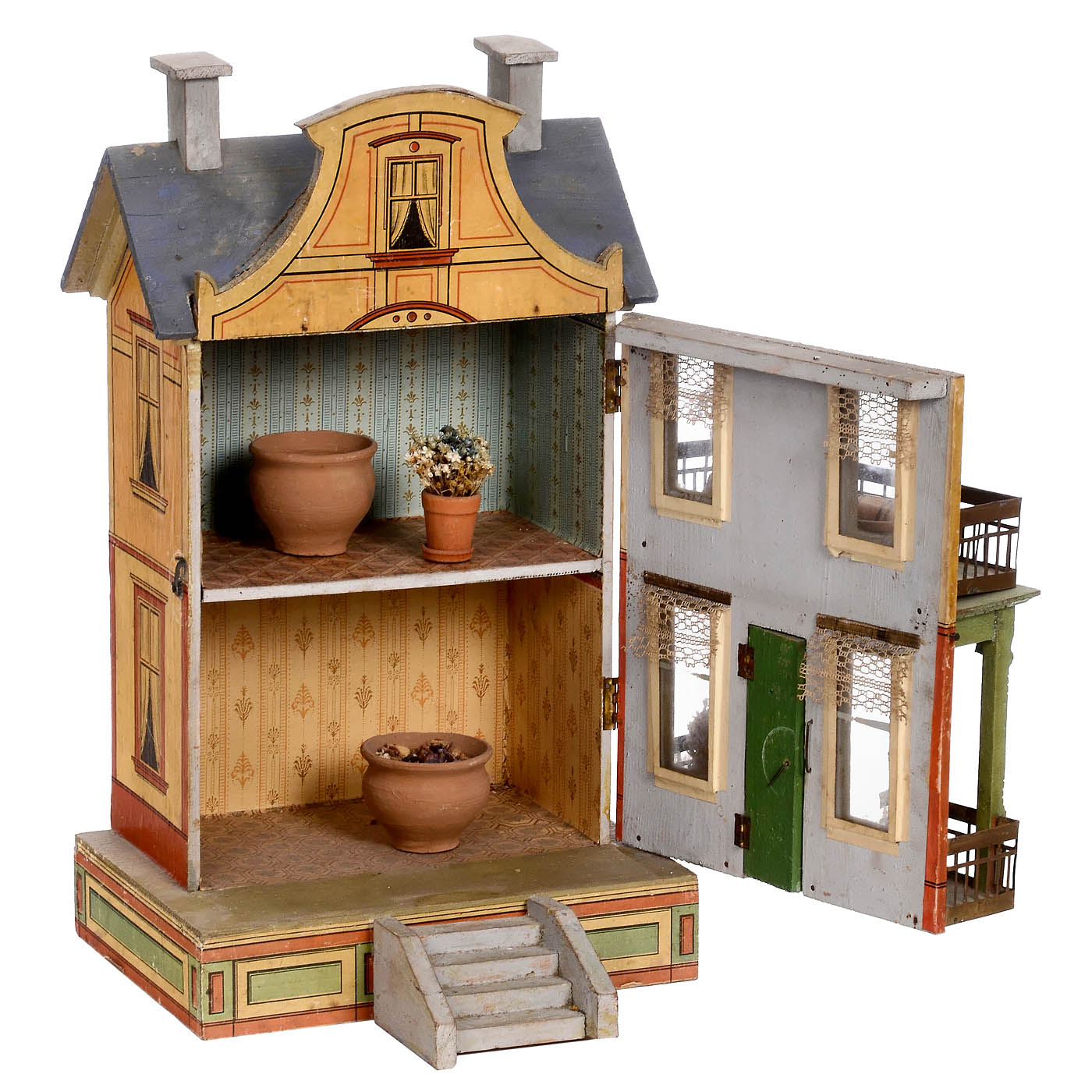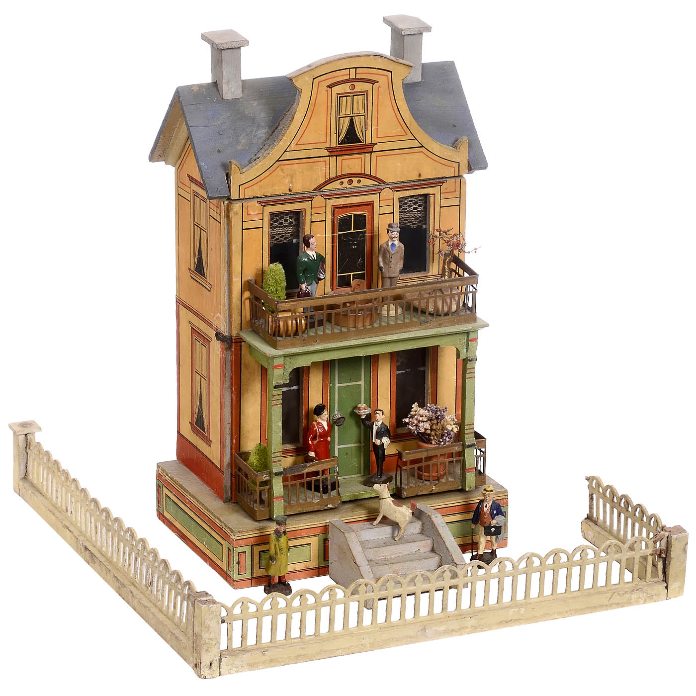 Town villa with blue roof and gabled dormer, wood construction with lithographic exteriors, 2 floors with 2 rooms, glazed windows with curtains, wallpaper, opening door, open veranda and balcony with decoration, three-part fence and 19 figures (not all appropriate for the doll's house). Overall: 10 1/5 x 11 x 14 ¾ in. - A rarely found doll's house. - Literature: "Moritz Gottschalk 1892-1931", Cieslik Verlag 2000.