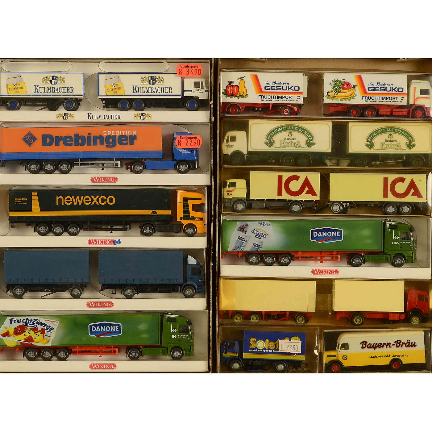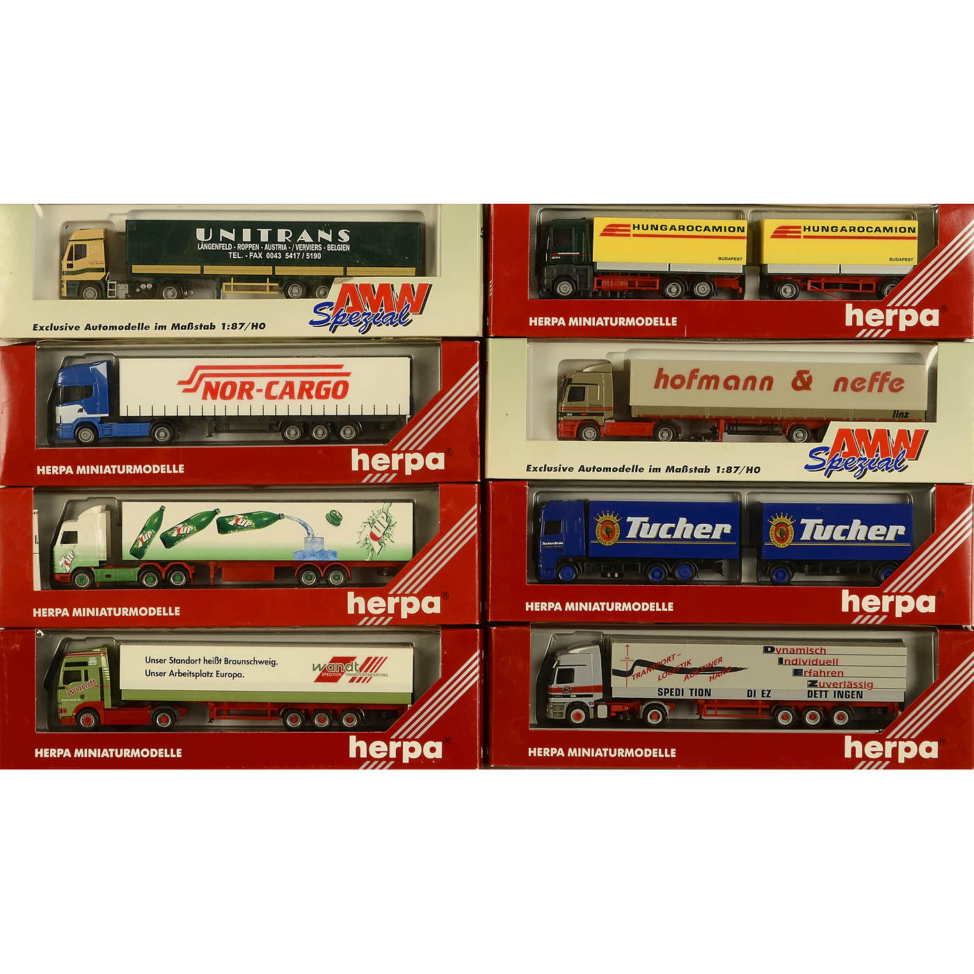 302 plastic models by AMW, Albedo, Herpa, Roskopf and BS Modelle, Igra, Faller, Roco and Wiking, semi-trailers, tank trucks, refrigerated trucks, tractor units and others, in original boxes, vehicles in mint condition, some boxes with minor storage-related wear. - In addition: 50 more vehicles in damaged boxes. - Not all pictured.