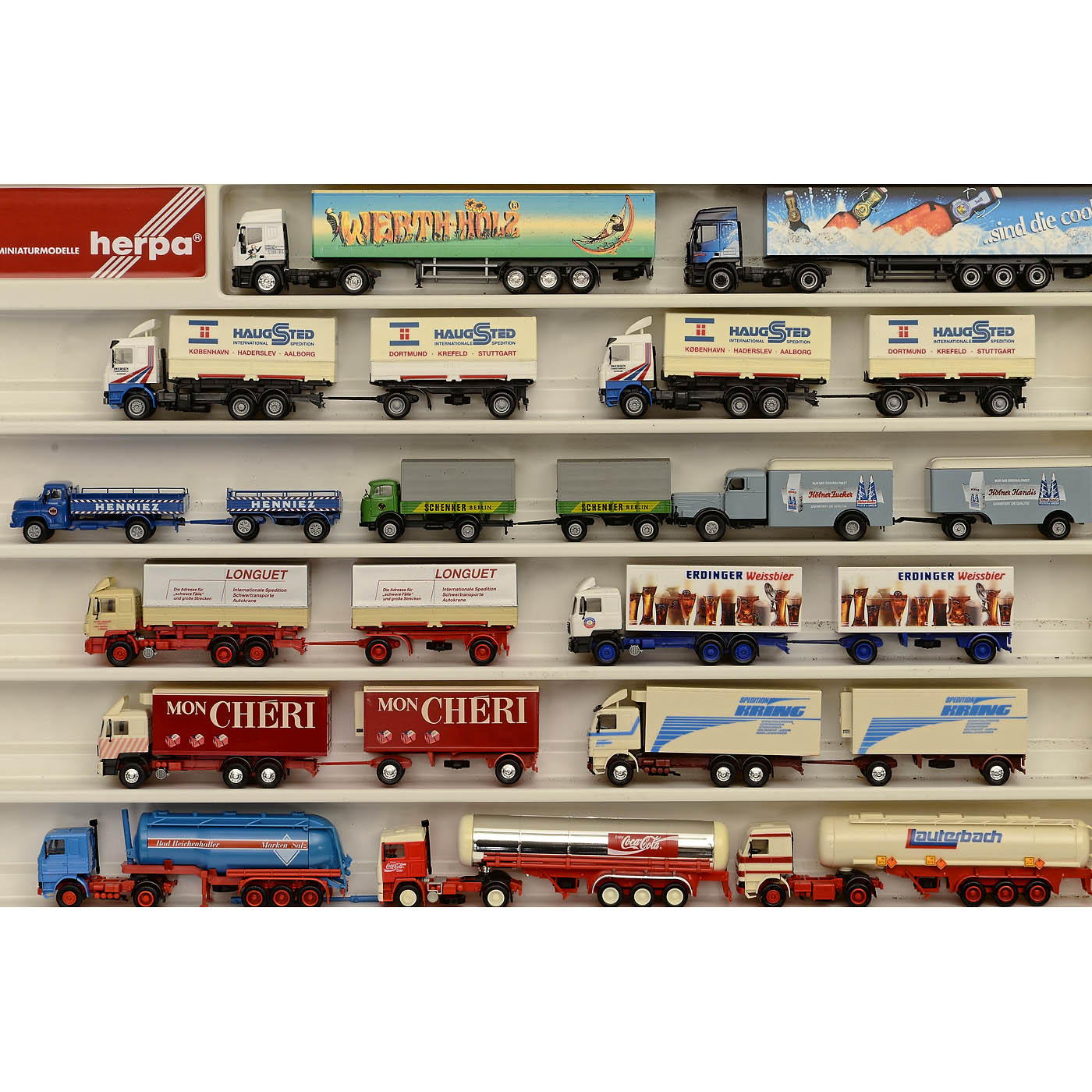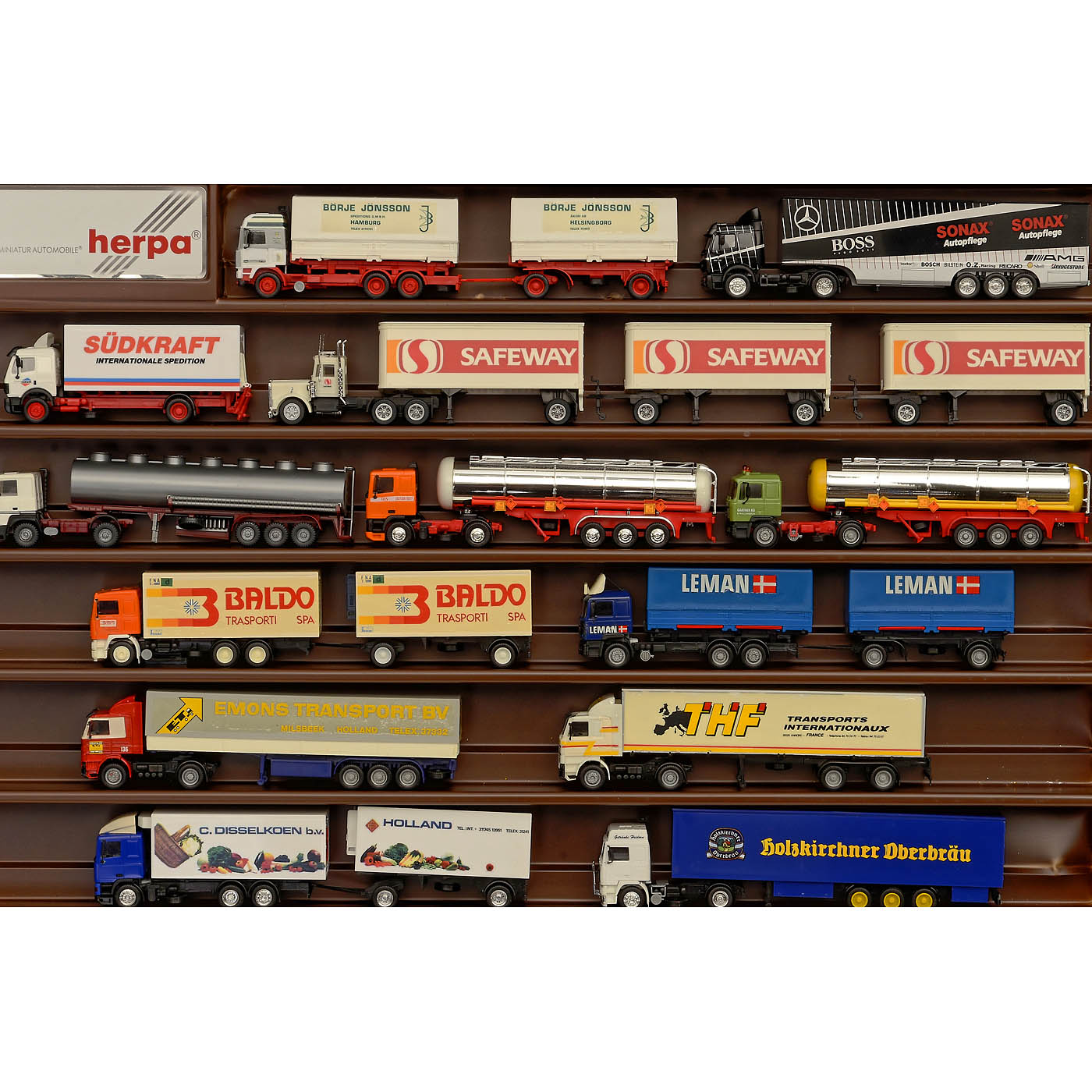 328 plastic models by AMW, Albedo, Herpa, Roco, Wiking and Brekina, in Herpa display cases, semi-trailers, tank trucks, refrigerated trucks, tractor units, transporters, military vehicles and others, vehicles in good condition, cases with age-related wear.