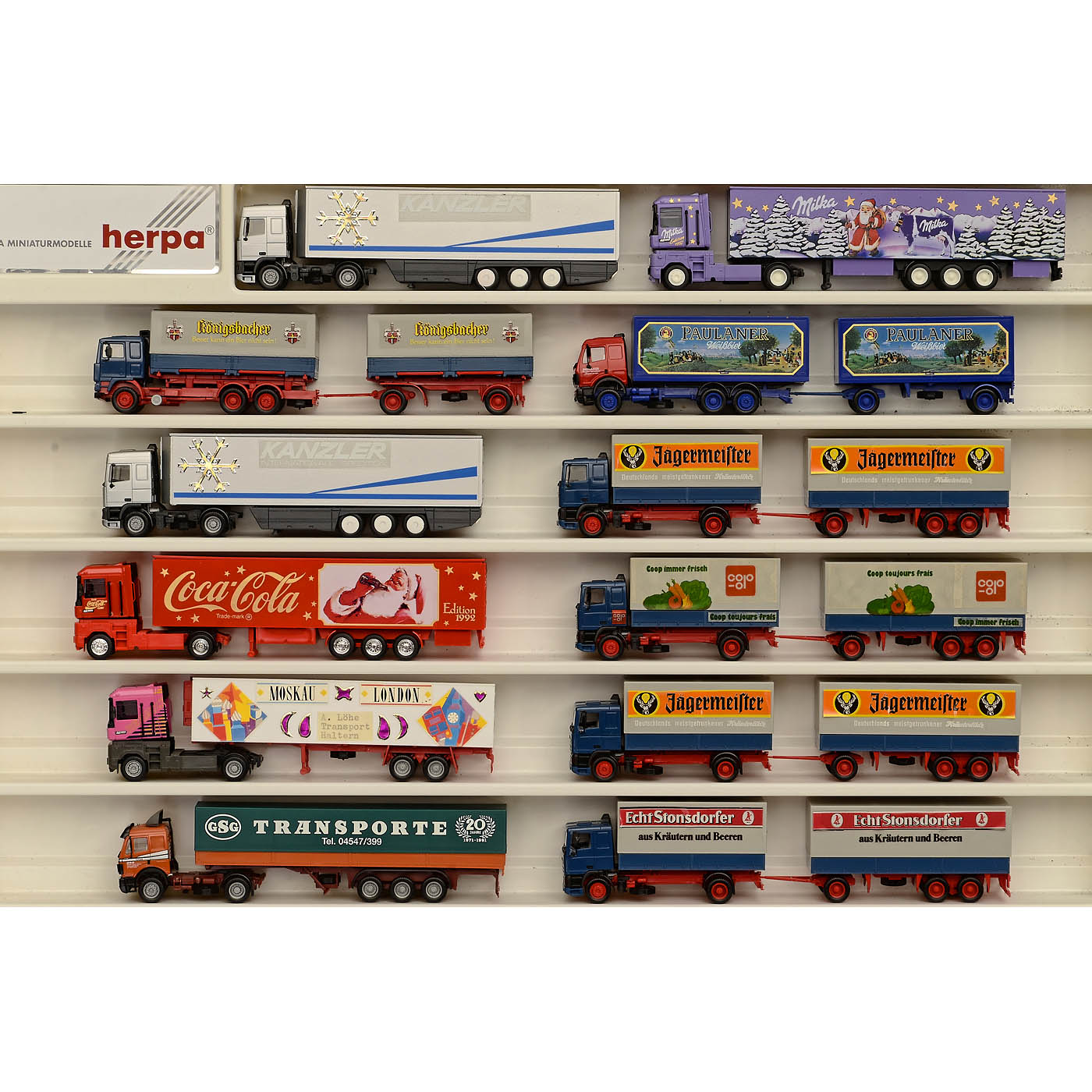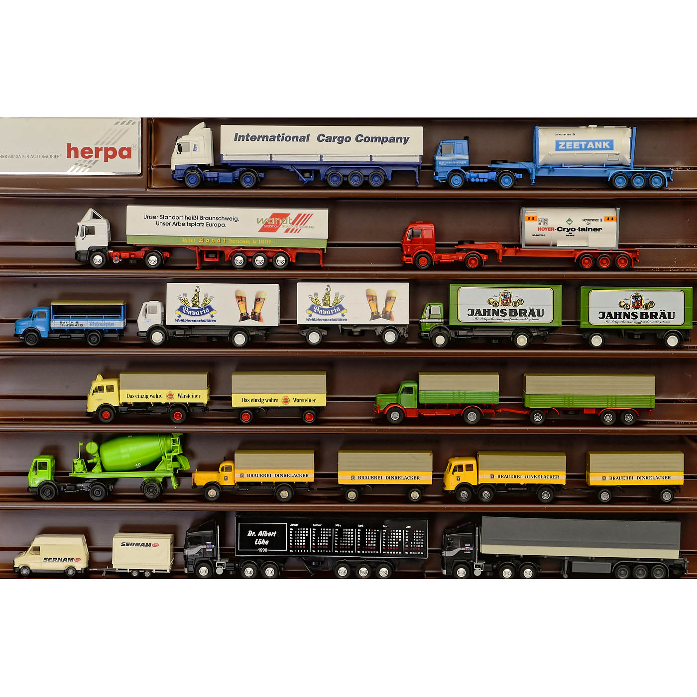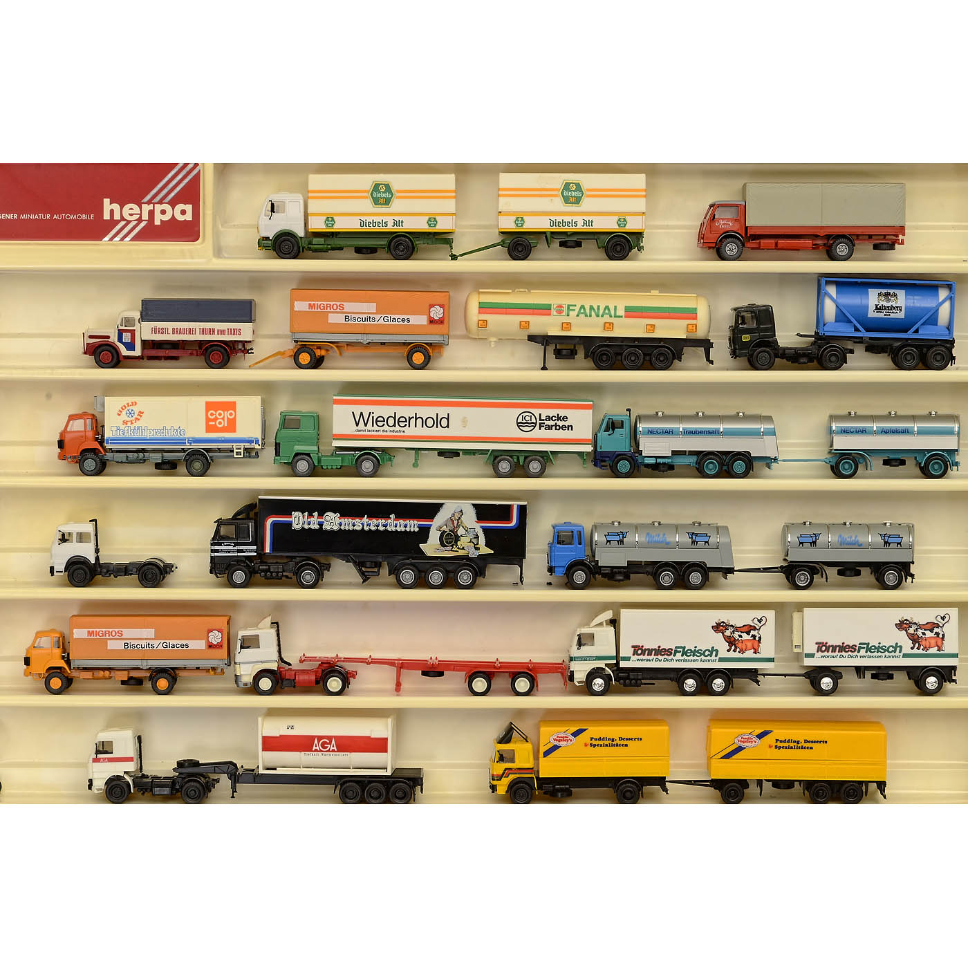 429 plastic models by Albedo, Praline, Herpa, Roco, Wiking and Brekina, in Herpa display cases, semi-trailers, tank trucks, refrigerated trucks, tractor units, transporters, military vehicles and others, vehicles mostly in good condition, cases with age-related wear.