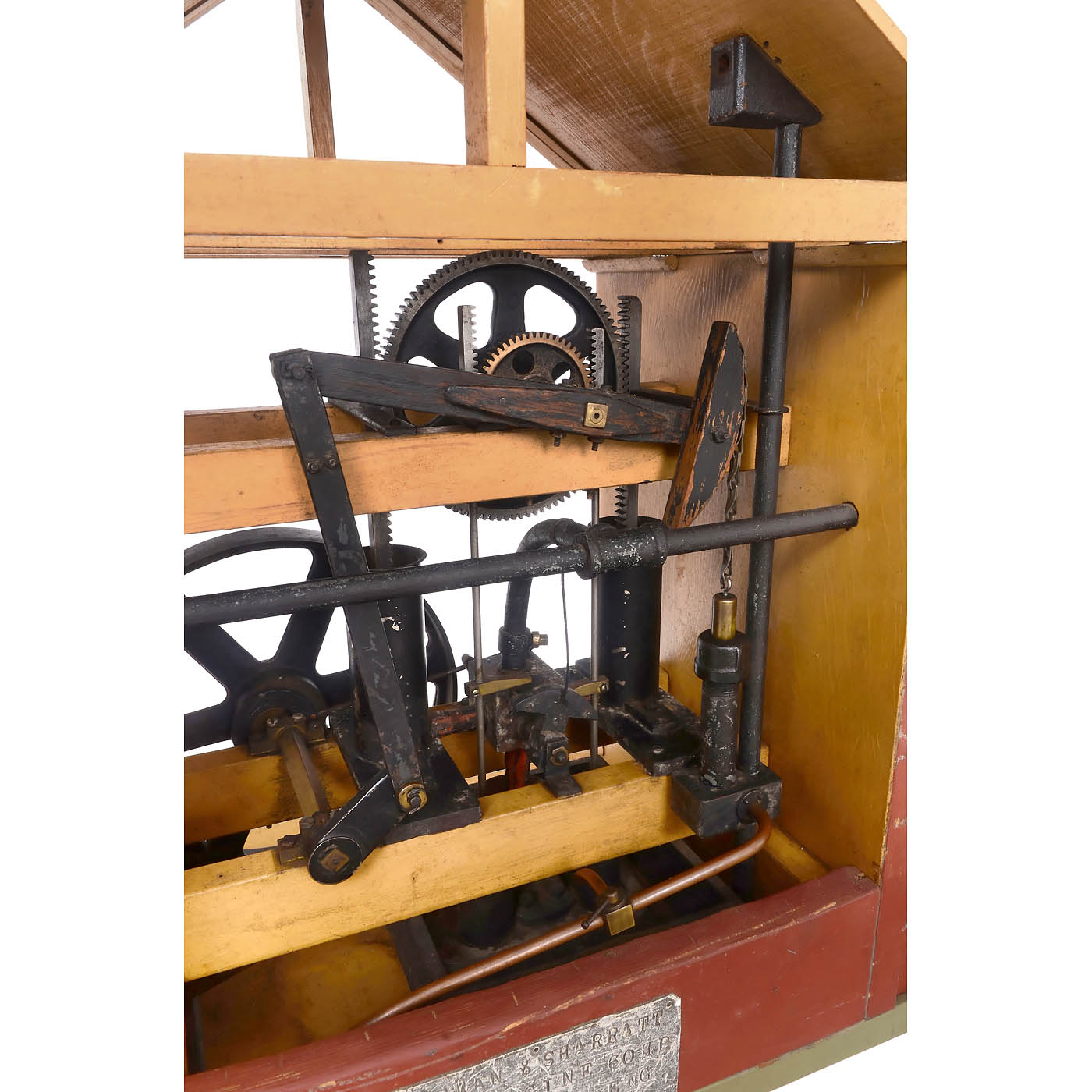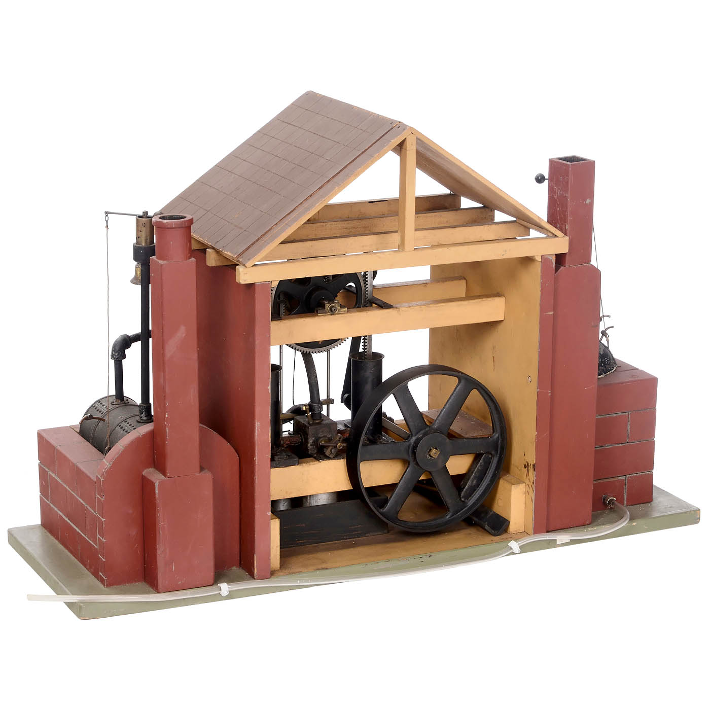 Demonstration model of a pumping station, engraved on plaque: "Bateman & Sharratt, Rack Engine 60 H.P., Manchester Eng, 1794 to 1824", two vertical cylinders, Ø 1 ½ in. each, upwards emerging racks, drive on central gear wheel, valve control with rack gear, beam connected with a chain to the pump, 8-inch flywheel, 2 side-mounted lead and sheet steel boilers with pressure safety valves, in later painted pine engine house, overall dimensions 32 1/3 x 11 3/5 x 21 in. - An exceptionally interesting model of an early English steam engine, in very good working condition, tested with compressed air.