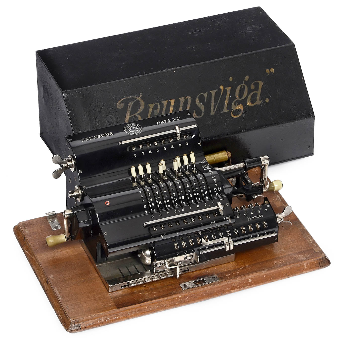 1) Brunsviga J, c. 1912, with 9, 8 and 13 digits, no. 28997, with safety device for locking the setting levers, large model, weight 18.5 kg, with oak base and sheet metal cover. - 2) Walther WR10, c. 1952, with 6, 6 and 10 digits, no. 71545, with back transfer. - And: 3) Original Odhner 25, c. 1940, Sweden, with 10, 8 and 13 digits, no. 146198. - All machines work.