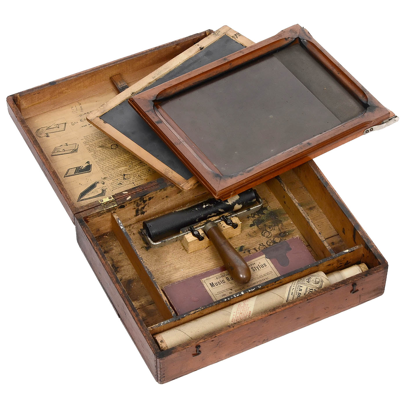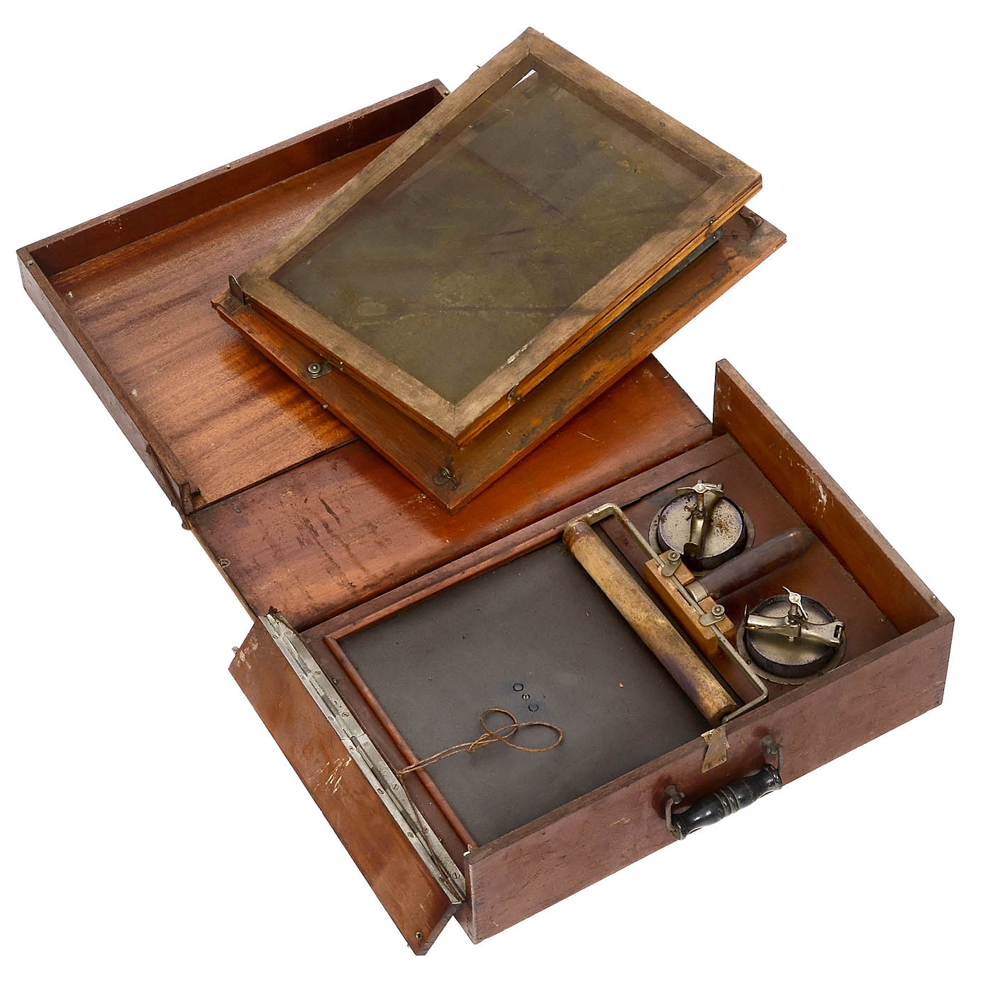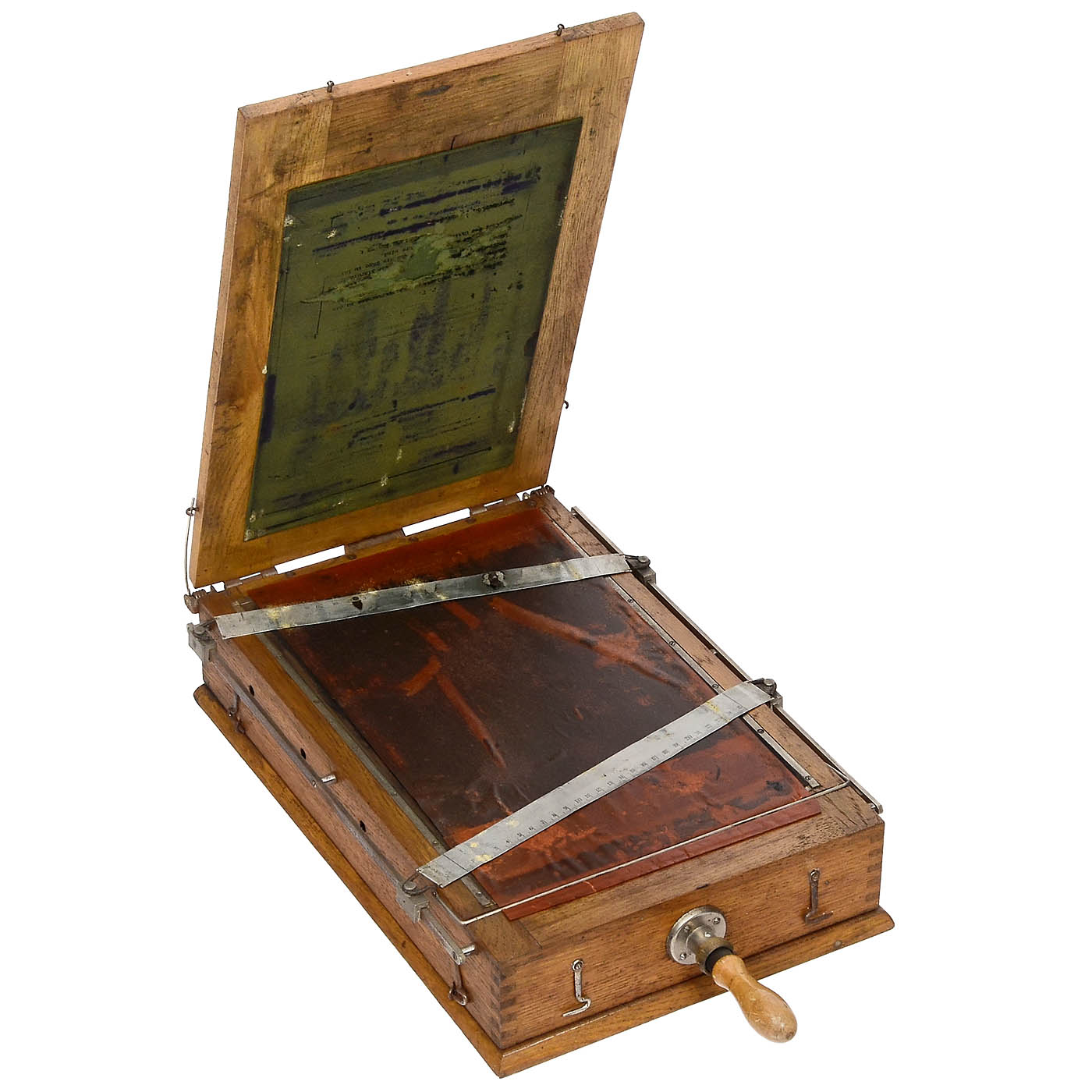 1) Edison Mimeograph, stencil copying device in original wood case, designed and patented by Thomas Alva Edison, manufactured and traded by A.B. Dick & Co., Chicago, Illinois. - 2) Triumph, Krämer & Co, Elberfeld, Germany, with unusual coloring technique. - And: 3) Red-Seal Duplicator, Remington, USA, complete with frame and inking roller.