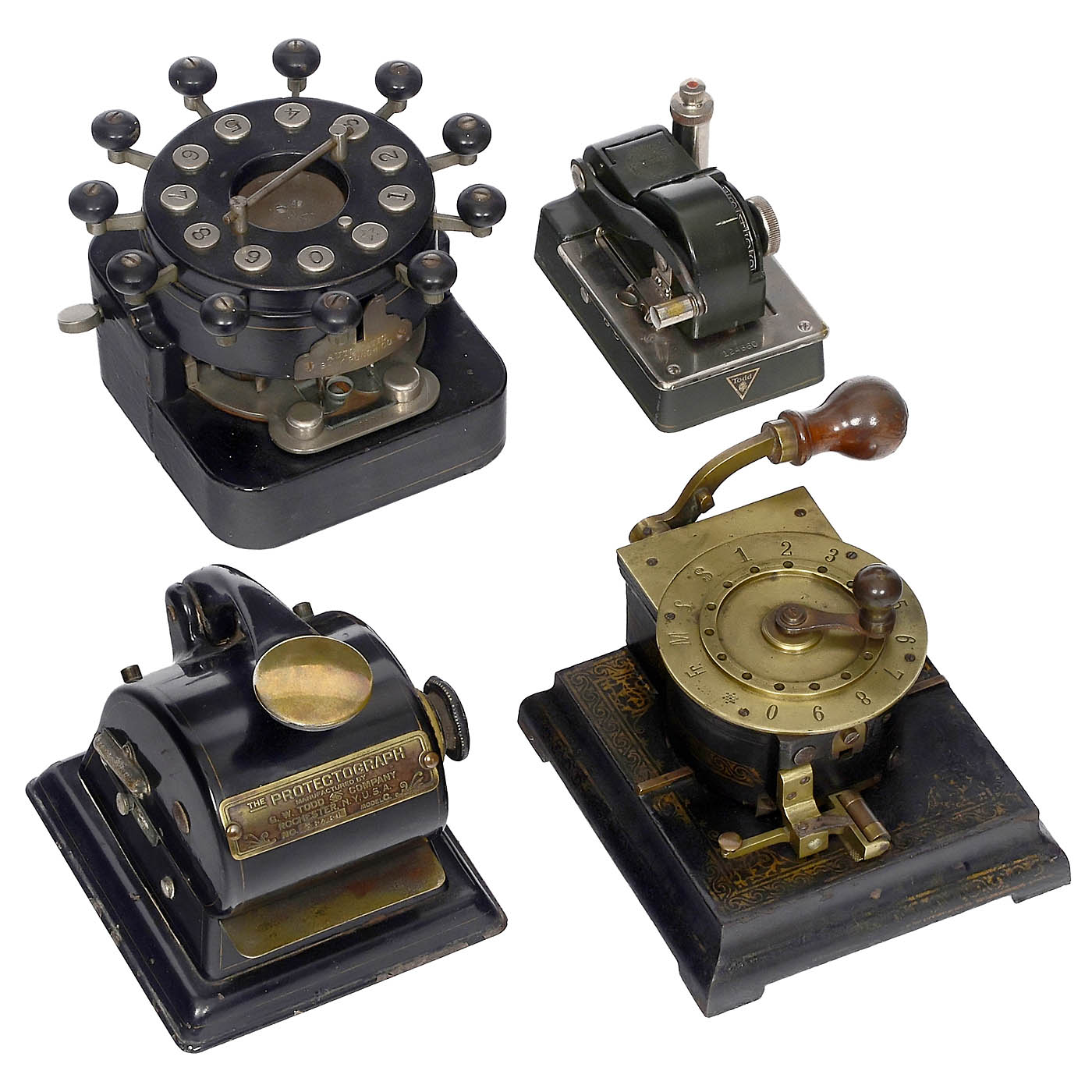 1) Todd Protectograph Personal Check Writer Model 1500, c. 1925, wheel-operated. - 2) Automatic Bank Punch, c. 1890, early American check writer of very unusual design, black, by Automatic Bank Punch Co., New York City. - 3) Abbott Automatic Check Perforator, c. 1900, with gilt decoration. - And: 4) The Protectograph Model C, Todd Company, USA.