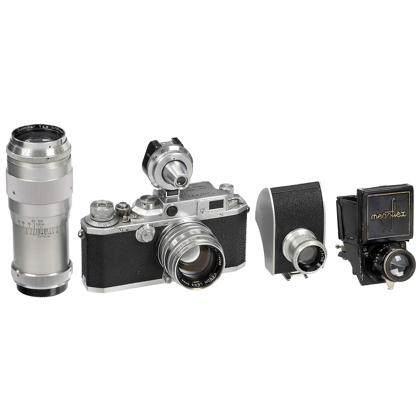 1) Hugo Meyer & Co., Görlitz. Megoflex no. 860, SLR rangefinder for Leica, engraved "II" on the underside, adjustable, focusing screen image good, working smoothly, version without additional mirror. (3-/3) - 2) Canon, Japan. Canon IIIA, no. 65555, attractive number, with Canon Lens 1.8/50 mm no. 118295 and Leitz Vidom viewfinder, optics good under point light, shutter working but remains open for all slow speeds, rangefinder accurate. (3-4/3-) - 3) Kühn, Wetzlar. Flexameter. (3-/3) - And: 4) Steinheil, Munich. Culminar 4.5/135 mm no. 626674, for M39 with rangefinder, with case, optics good under point light. (3/3)