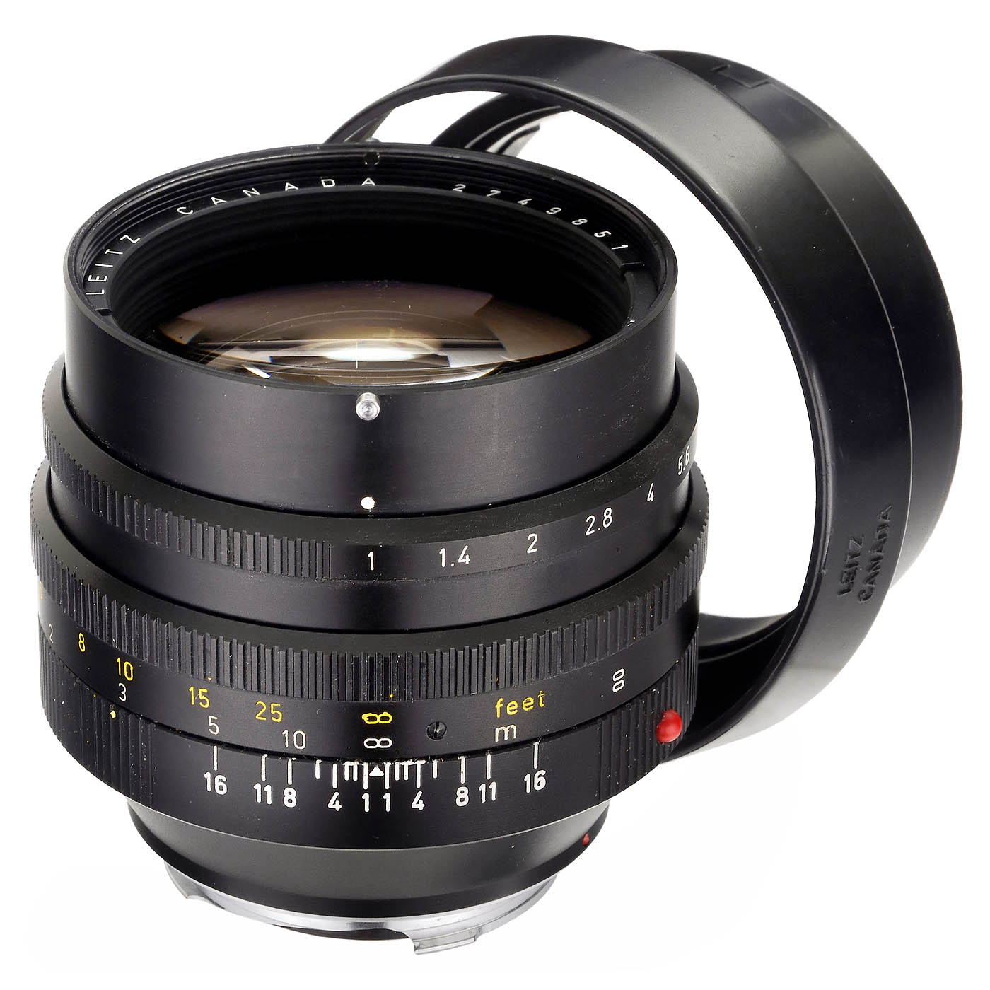 Leitz, Canada. No. 2749851, first version for 58mm filter, with original sunshade 12519 and back cap, glass clean under point light, good condition. An early Noctilux from the first year of production.