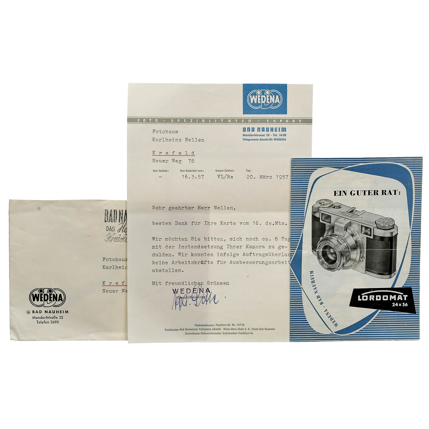 1) Minolta, Japan. Minolta Super A, with Super Rokkor 2/5 cm, two sets of instructions and case, detachable Minolta-meter exposure meter working, rangefinder and shutter working. (3/3) - 2-3) Voss, Ulm. Diax Ia, with Xenar 2.8/45 mm, Isconar 4.5/85 mm and Steinheil viewfinder 35/38-85/90-135 mm. (3/3) - 4) Leidolf, Wetzlar. Lordomat no. 59523, Lordonar 2.8/50 mm. (3/3) - 5) Lordomat C35 no. 121965, Lordonar 2.8/50 mm. (2-/3-) - 6) Lordomat SLE no. 180829, Telordon 4.5/90 mm. (3/-) - 7-8) Schacht-Lordonar 4/90 mm and Schacht-Travenar 4/135 mm, with rear cap. - And: 9) Lordox flash with Triplon 2.8/5 cm. (3/3). - In addition: accessories brochure from Lordox and Wedena with prices list and an original customer letter from Wedena.