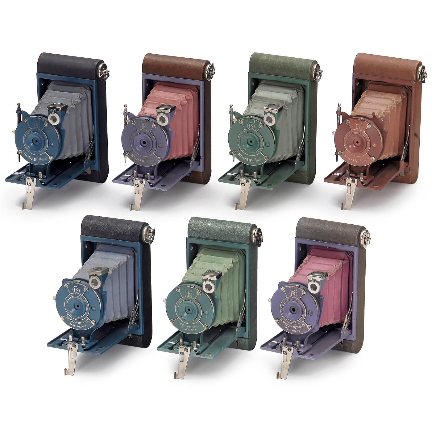 Kodak, USA. 1-4) Kodak Petite for 127-rollfilm and Autographic back in the color versions: light green/light green bellows, violet and brown with red bellows, blue/blue bellows (one fitting missing) and pink bellows (brilliant viewfinder missing), one with case and instructions, all four with pen. - 5-6) Rainbow Hawk-Eye in the color versions: blue/blue bellows and purple/red bellows. - And: 7) Vest-Pocket Hawk-Eye in green/light-green bellows, bellows split, stand loose.