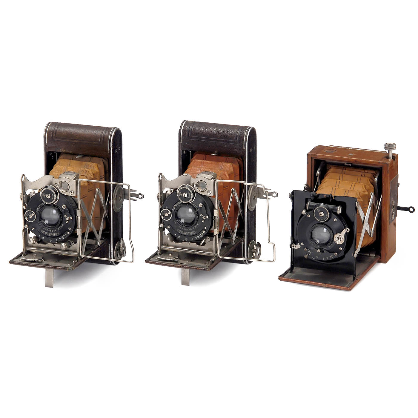1) Contessa-Nettel, Stuttgart. Piccolette Luxus no. 396629, for 4 x 6.5 cm, brown leather covering and brown bellows, with Tessar 4.5/7.5 cm lens in Compur shutter, working. Attractive petite camera. (3/3) - 2) Piccolette Luxus, no. 451089, brown leather covering, brown bellows, Tessar 4.5/7.5 cm lens in Compur, working, with slightly different typography. (3-/3) - And: 3) W.S., Germany. Tropical strut-folding camera for 4.5 x 6 cm, Tessar 4.5/7.5 cm lens in Compound shutter, working, with original focusing screen back marked "W.S.". (3-/3)