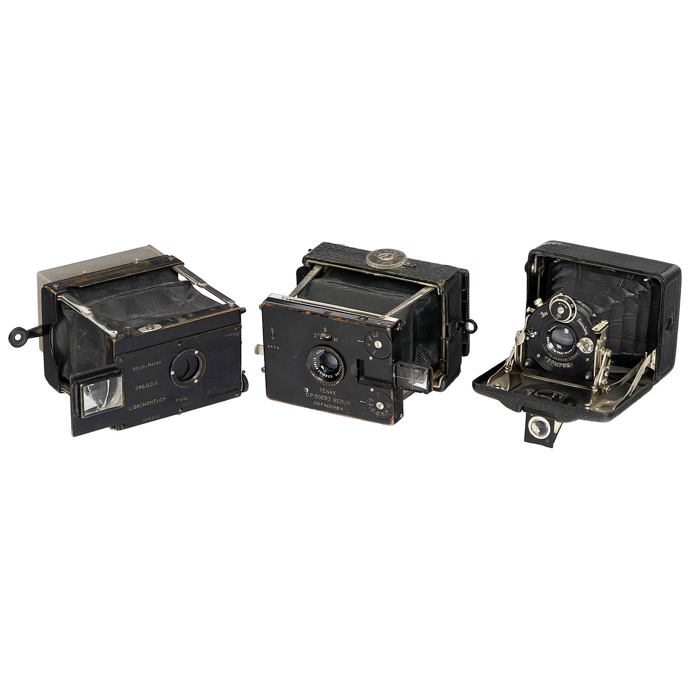 For 4.5 x 6 cm plates. 1) Gaumont, Paris. Block-Notes no. 4422, with Krauss-Tessar 6.3/72 mm lens and inset magazine, viewfinder cracked. - 2) Ica, Dresden. Atom, with Tessar 4.5/6.5 cm lens and focusing screen back. - And: 3) Goerz, Berlin. Tenax Luxus, dark-green leather-covered body and matching inset film casette, with a Dagor 6.8/7.5 cm lens.