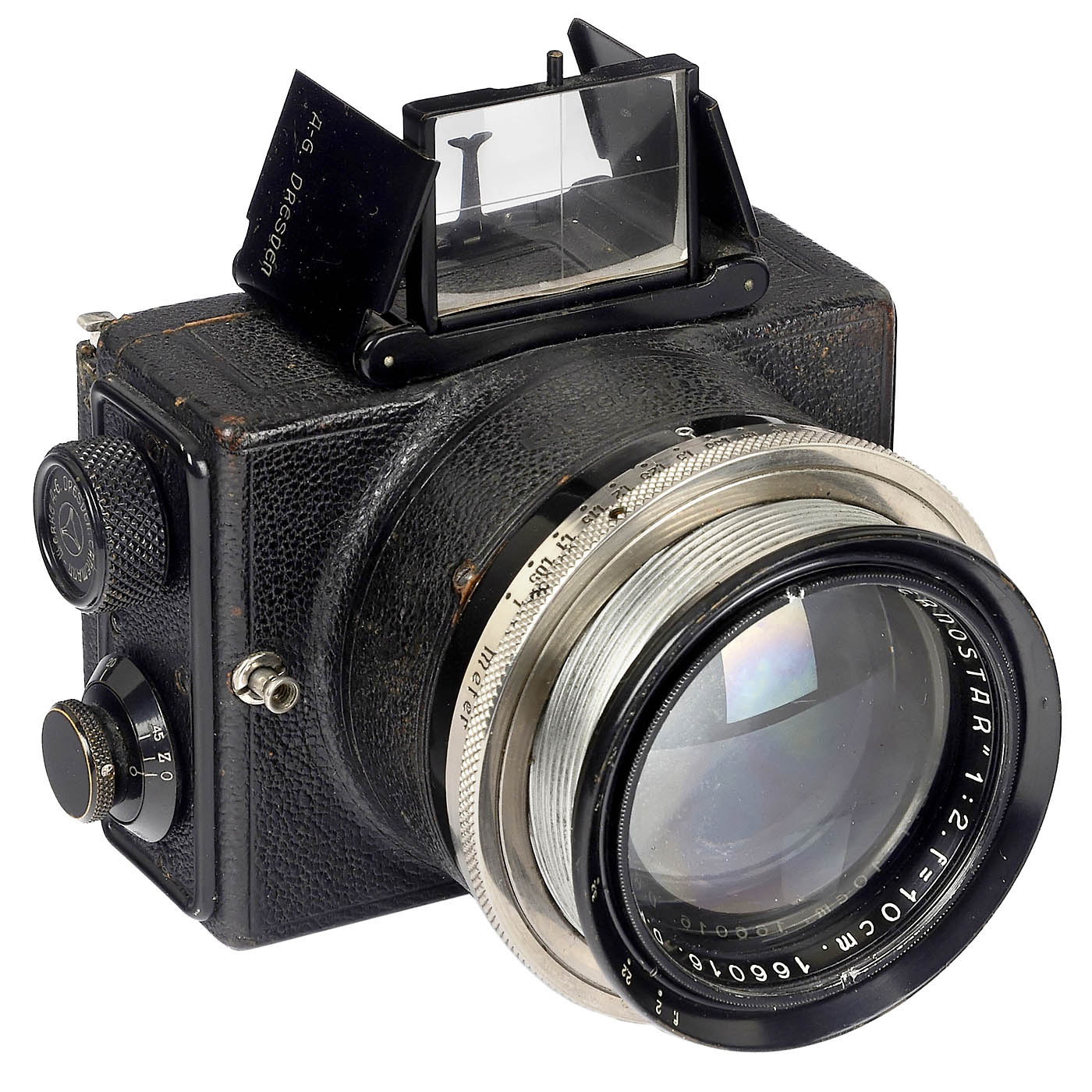 Ernemann, Dresden. No. 1236043, 4.5 x 6 cm, with Ernemann Anastigmat Ernostar 2/10 cm lens no. 166016, focal plane shutter 1-1/1000 sec. and focusing screen back, working hesitantly, with fog or cement defect when viewed under point light, ground-glass missing. - A milestone in camera history.
