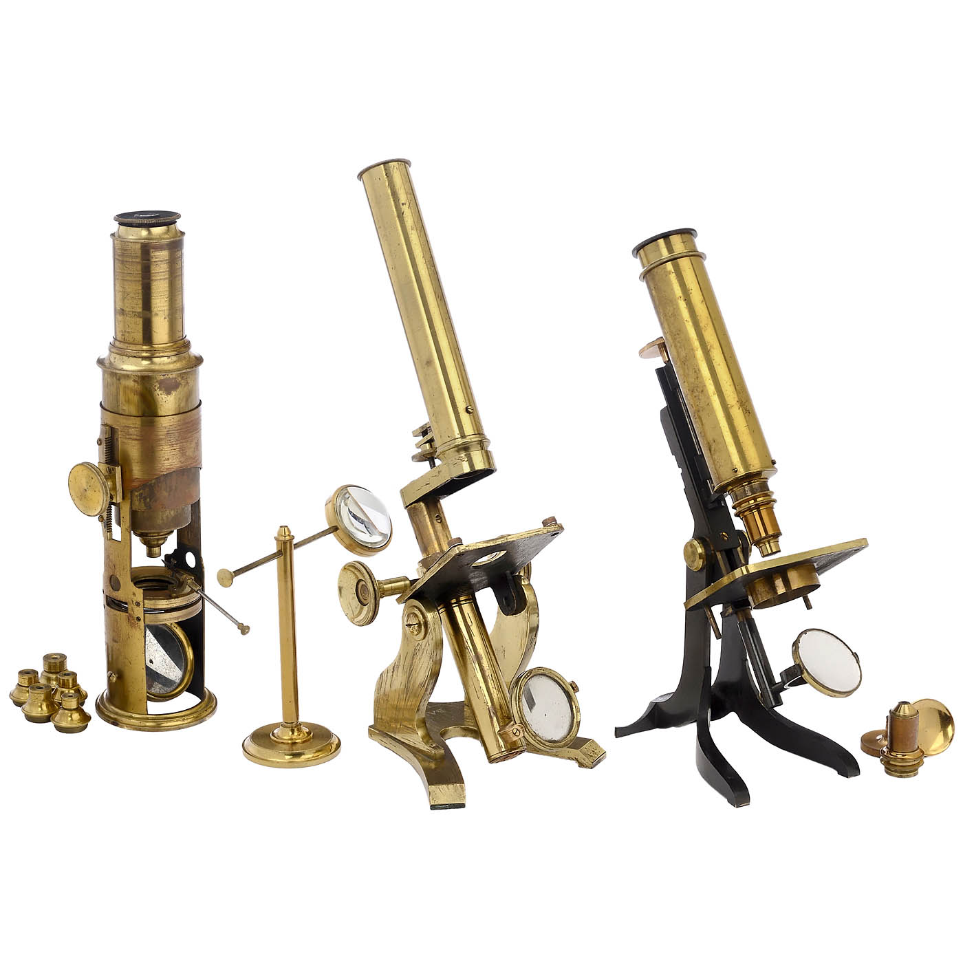 1) Drum microscope, c. 1860, unmarked, lacquered brass, concave mirror, drawtube, eyepiece, 6 objectives, live cell, forceps, Lieberkuhn reflector, height 10 in., in matching mahogany case, box lid with red velvet lining. - 2) Baker, London. Ross-pattern microscope, polished brass, concave mirror, rack-and-pinion focussing, eyepiece, without objective, height 12 ¼ in., with bull's eye lens in matching mahogany case. - And: 3) C. Collins, Optician, London. Original lacquered brass, concave mirror, rack-and-pinion drive defective, height 10 5/8 in., in matching mahogany case.
