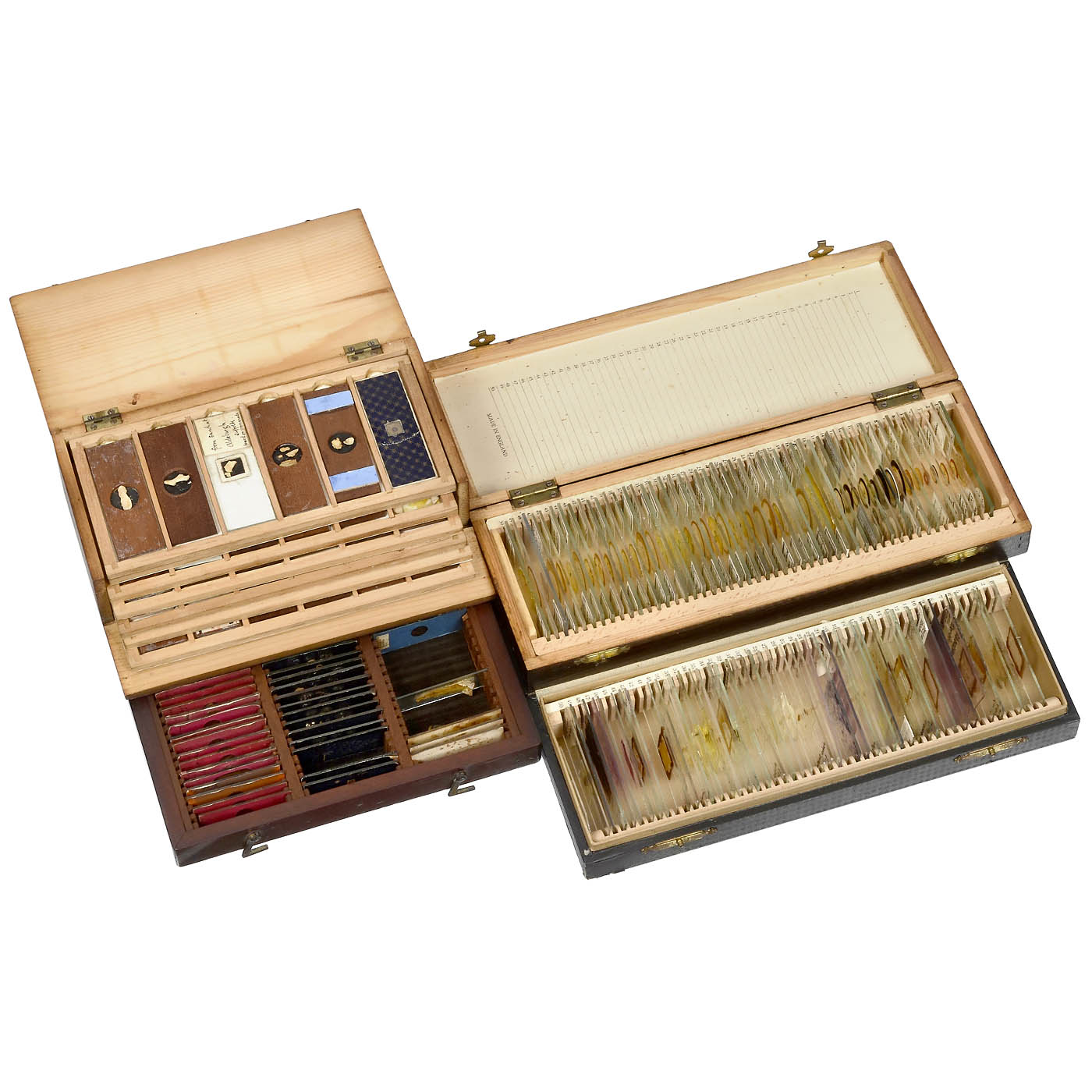4 boxes with approx. 150 specimens, England and Germany; a brass small drum microscope, height 6 in.; 14 objectives, some in brass cases; a test plate according to Abbe, C. Zeiss, Jena; a triple revolver; assorted other items, including magnifying glasses and condensers.