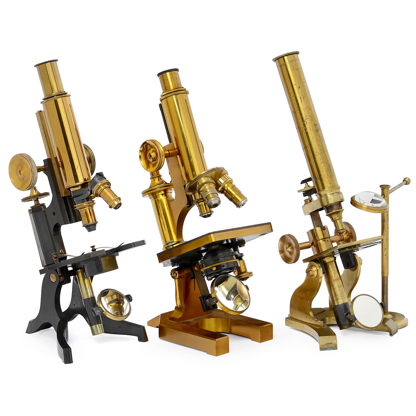 1) R. & J. Beck Ltd., London, c. 1895, no. 24869, original lacquered brass, 90˚ tilting tripod, double mirror, substage height-adjustable condenser with iris diaphragm, graduated draw tube, coarse adjustment with 2 knurled screws, micrometer thumbscrew fine adjustment on the column, 3 objectives in a triple turret, 1 eyepiece, height of the instrument 11 ¾ in. - 2) Unmarked, c. 1895, claw foot, tilting stand, original lacquered brass, concave mirror, substage pinhole diaphragm, 2 clamps on the stage, coarse adjustment with 2 knurled screws, fine adjustment to the objective, tube screwed into the arm, 1 eyepiece, 1 objective, with bull's-eye lens and life cell in matching mahogany case, drawer for microscope slides, height 12 ¼ in. - And: 3) James Lucking, Birmingham, original lacquered and black-painted brass, claw base, double mirror, coarse adjustment with 2 knurled screws, fine adjustment on the column, 2 objectives in double turret, 1 eyepiece, height 11 2/5 in., in matching mahogany case.