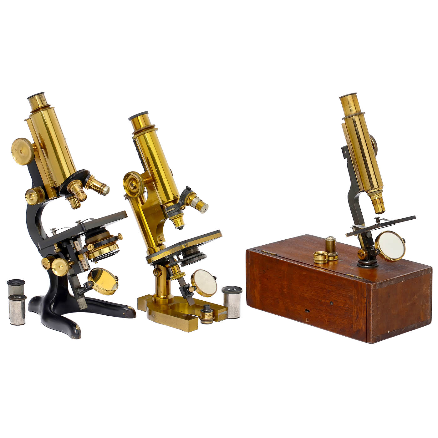1) "R. & J. Beck, London", no. 9994, original lacquered brass, tilting stand, double mirror, substage height-adjustable condenser, double turret, coarse and fine adjustment, 2 eyepieces, 3 objectives, height 10 1/5 in., in matching mahogany case. - 2) "Watson & Sons, London", no. 20060, original lacquered and black-painted brass, case with socket for the instrument, concave single mirror, coarse adjustment with knurled screw, 1 eyepiece, 2 objectives, height with case 13 in., retailer's label in case: "Scott Opticians, Glasgow". - And: 3) "Watson & Sons, London", no. 14540, original lacquered and black-painted brass, tilting stand, double mirror, substage height-adjustable iris diaphragm with condenser, triple turret, coarse and fine adjustment, 3 eyepieces, 3 objectives, height 12 ½ in., in matching mahogany case.