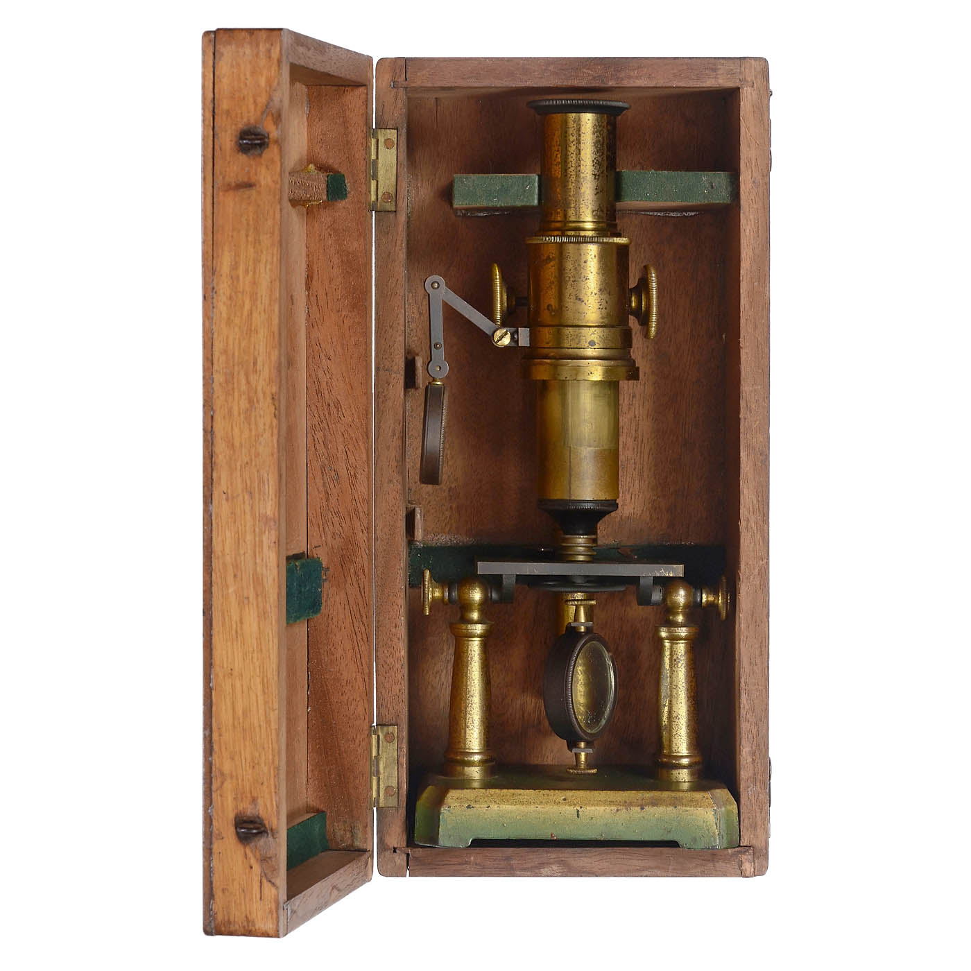 Unmarked, original lacquered brass, with stage condensors, 1 eyepiece, 3 objectives screwed into each other, in matching mahogany cases. 1) Black-painted horseshoe base, single mirror, substage pinhole disc, sliding tube, fine adjustment with knurled screw on the column, height 10 1/5 in. - 2) Probably France (Hartnack or Nachet), circular leaded brass base, tubular pillar with a ball-and-socket foot, single mirror, adjustment with rack-and-pinion drive, height 9 in. - And: 3) Presumably France, green-and-gold-painted cast-metal square base with pair of tubular pillars, double mirror (1 mirror damaged), substage pinhole disc, rack and pinion adjustment, height 10 1/5 in.
