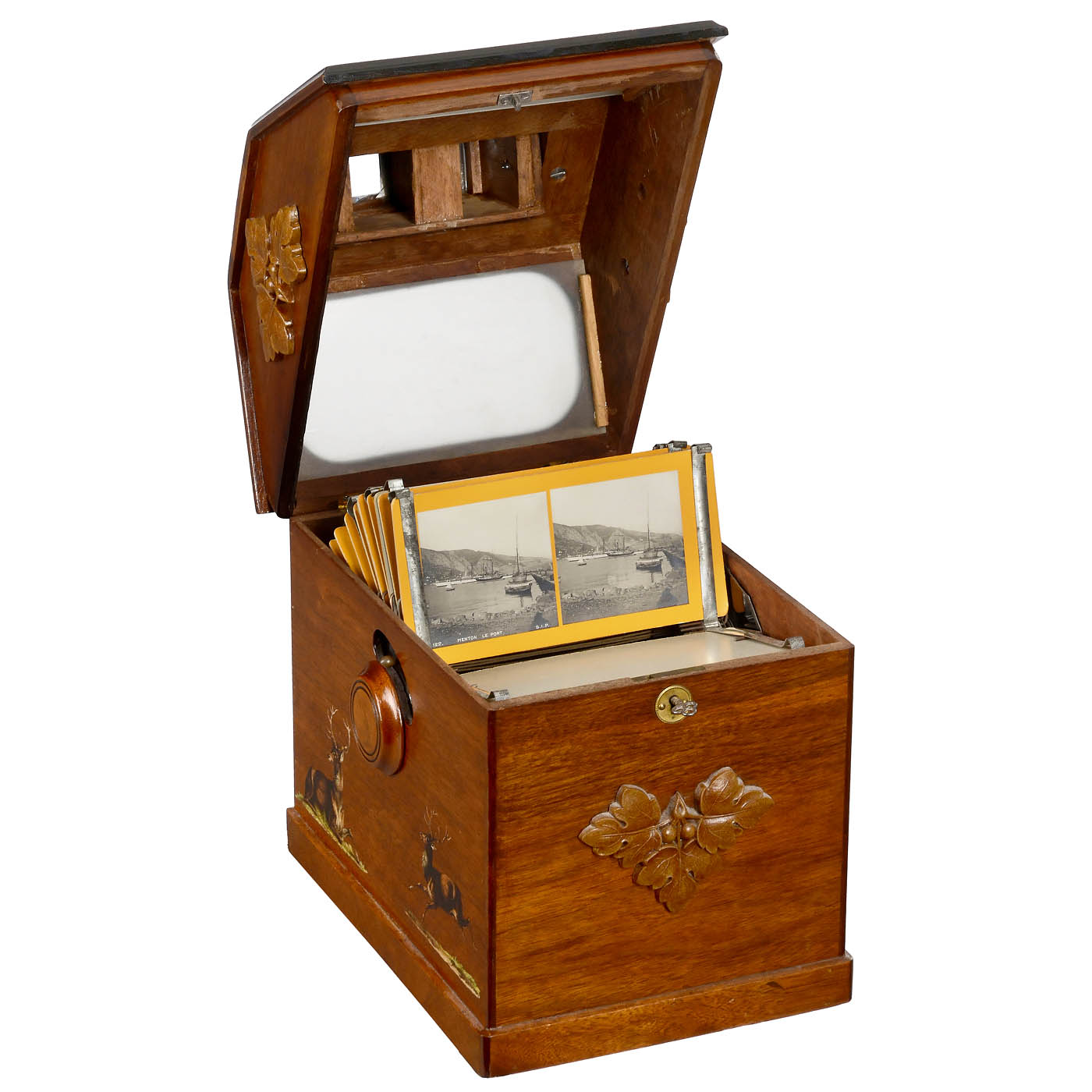J.W. Cadwell, North Reading, USA. For 100 paper stereo cards in 8 x 18 cm format, hexagonal walnut case, turning knobs on both sides, tilting eyepiece, two ground-glass screens (one cracked), double-sided mounts and approx. 70 stereo cards (mostly Italy and France).