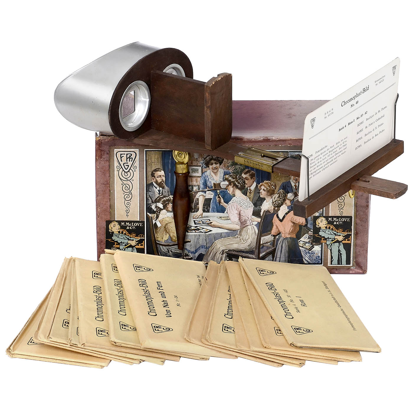 For stereo cards of 9 x 18 cm, in original boxes with color lithograph on the lid. 1) Special stereoscope for the English market by Georges Carette & Co., Nuremberg, manufacturer of the Iostereo viewer, with 17 series of Chromoplast cards in paper sleeves, published by "FPhG" Verlag der Farbenphothographischen Gesellschaft, Stuttgart, with list of titles in English. - And: 2) Weltpanorama Kosmos, by "Fita", Gebrüder Bing, Nuremberg, with 20 series of Chromoplast color cards in paper sleeves and about 50 Fita/Bing cards.