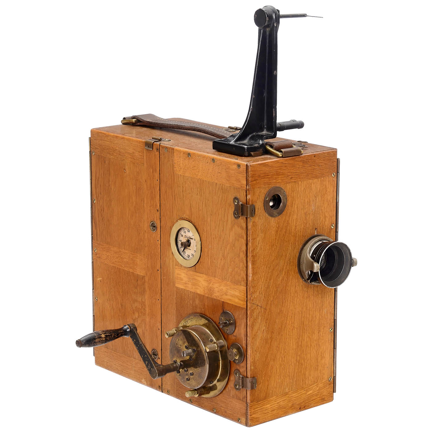 Zeiss Ikon, Dresden. 35 mm, for 60-meter film in two internal wood cassettes, with hand-turned double-claw movement, Ernemann Ernostar 2/50 mm lens and film as a focusing screen via viewing opening on the back (using the upside-down focusing screen image in the camera housing). - Note: The rare Ernemann intermediate gear for slow-motion recordings is located in front of the hand-turned connection. For additional use as a copier, a spool holder for the negative strip is located on the camera.