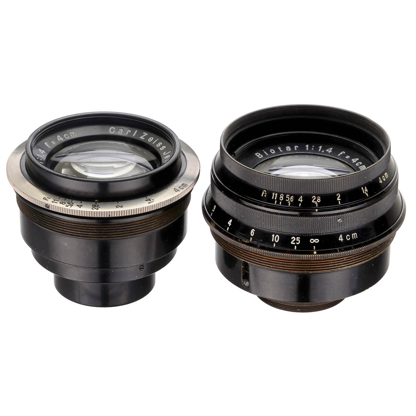 Carl Zeiss Jena. For the 35mm film format 18 x 24 mm, both lenses clean under point light. 1) No. 808496, with focusing mount and feet scale up to 1.2 feet, iris diaphragm up to 11, for a thread of approx. 52 mm Ø. The optical calculation is from 1927, production was in May 1930. - And: 2) No. 870648, in standard version, for a thread of approx. 48 mm Ø. - All lens elements can be unscrewed. - Rare high-speed lenses that were the forerunner of the equally high-speed Sonnar by Bertele.