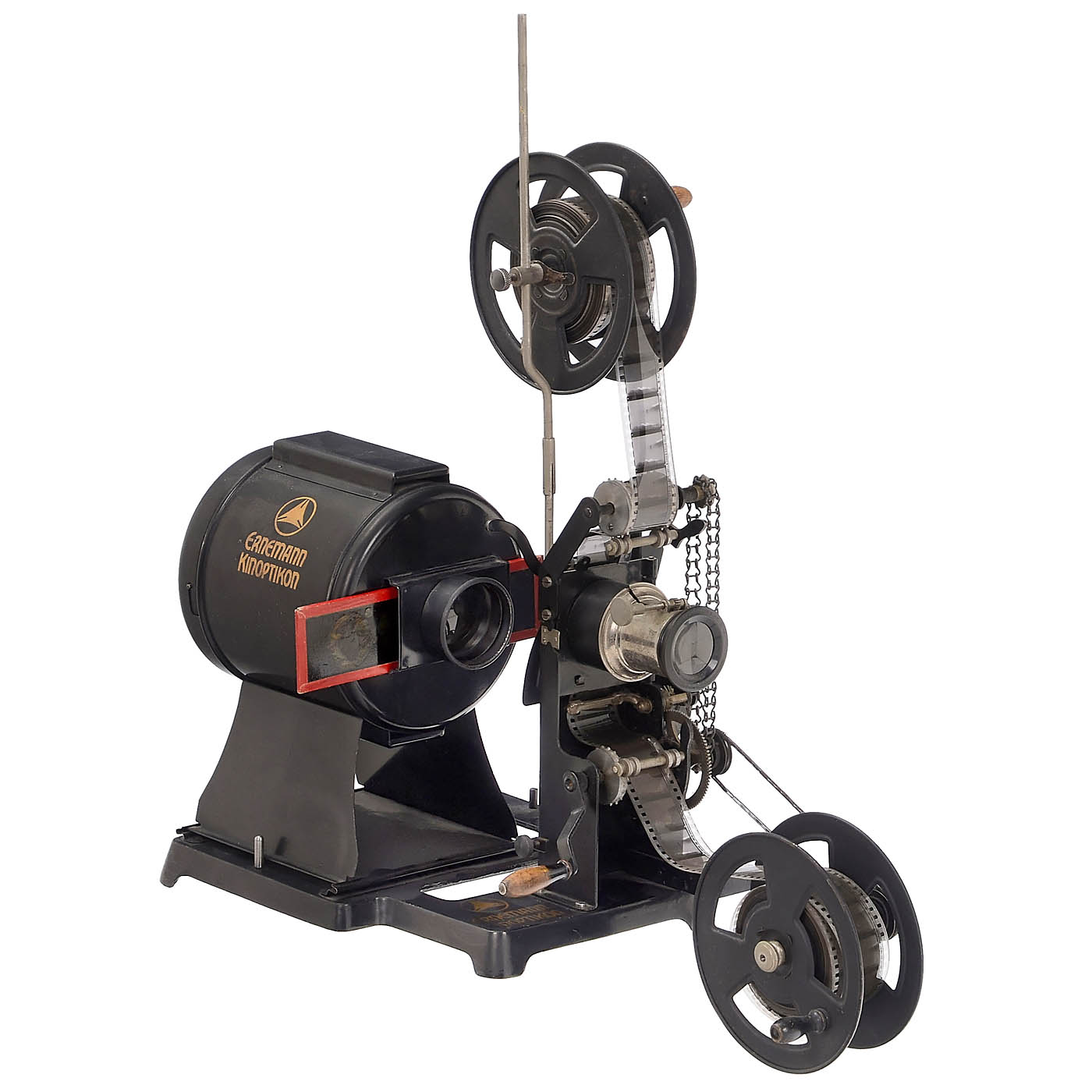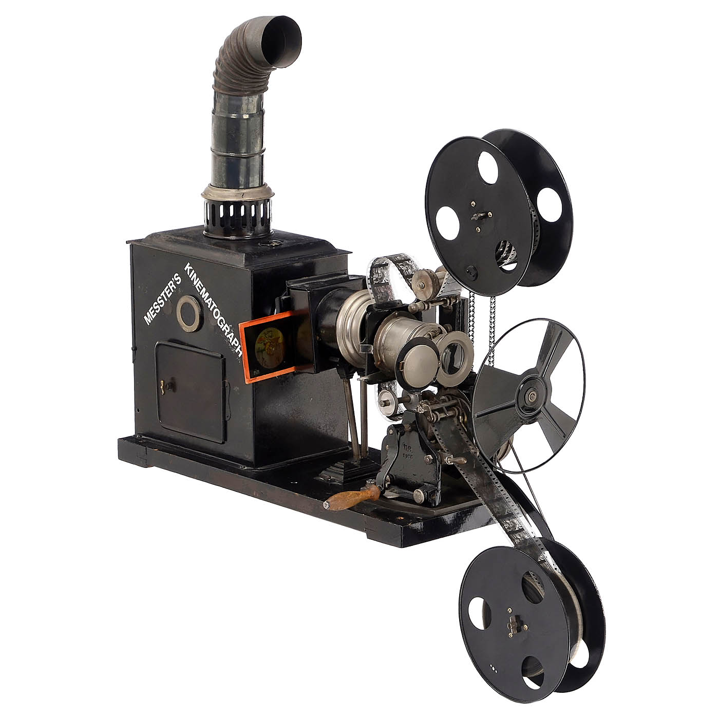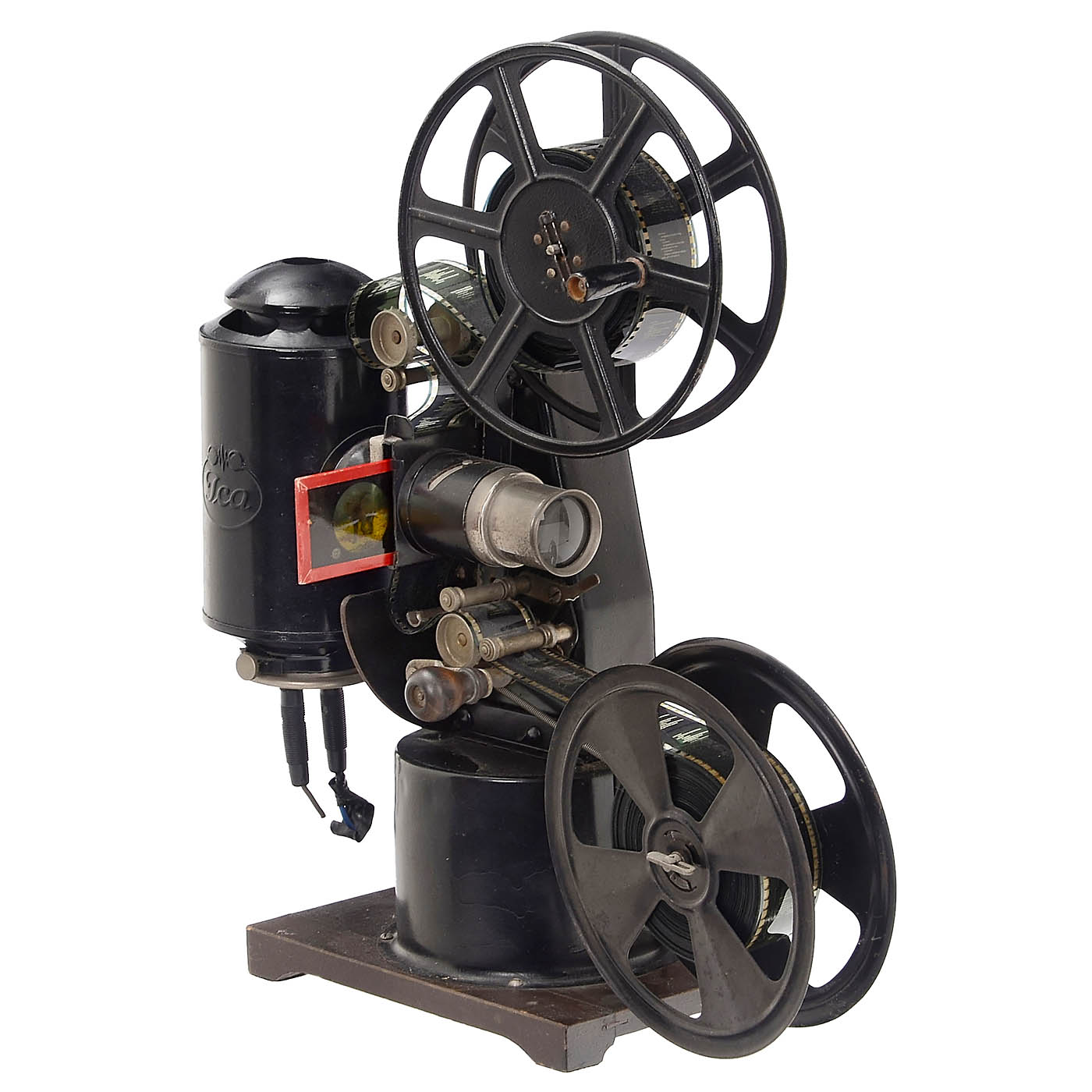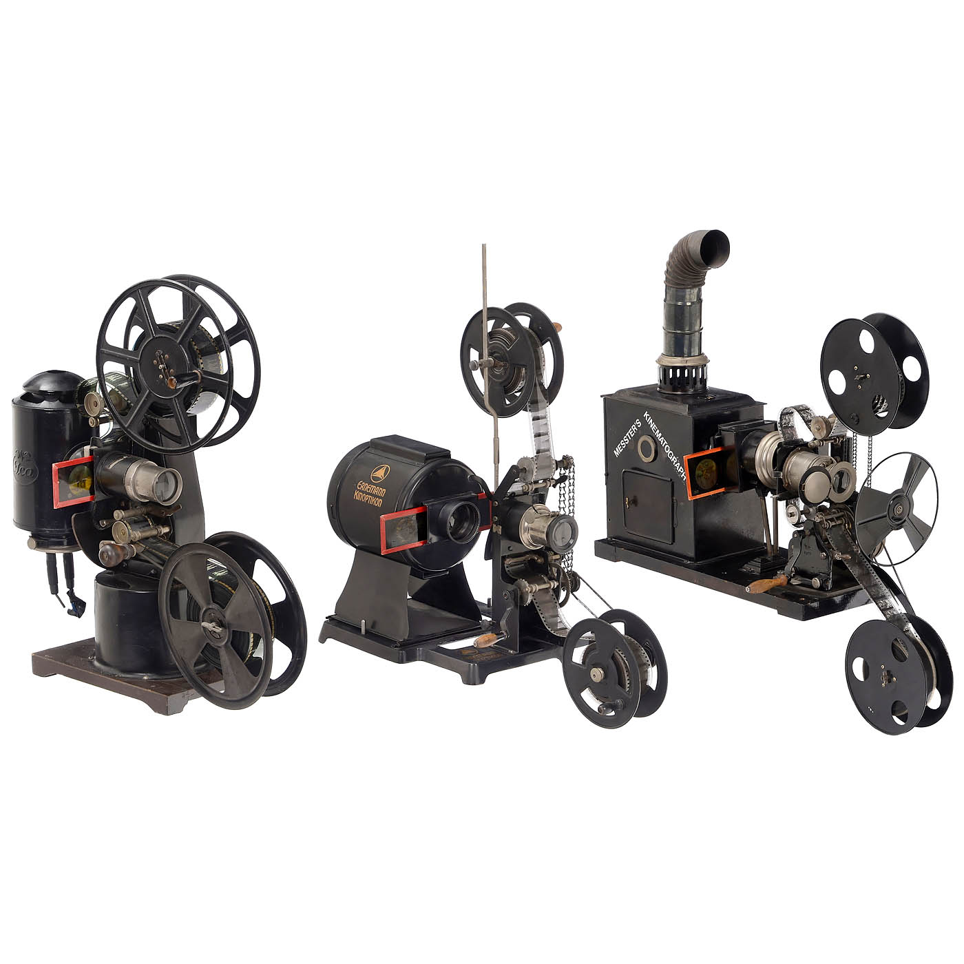 Three table projectors for use with 35mm film and as magic lanterns, all with beater mechanism. 1) Ica, Dresden. Ica Teddy, c. 1924. - 2) Krupp-Ernemann, Dresden. Ernemann Kinoptikon, c. 1922. - And: 3) Gebrüder Bing, Nuremberg. Bing cinematograph, c. 1910, with copy "Messter" label.