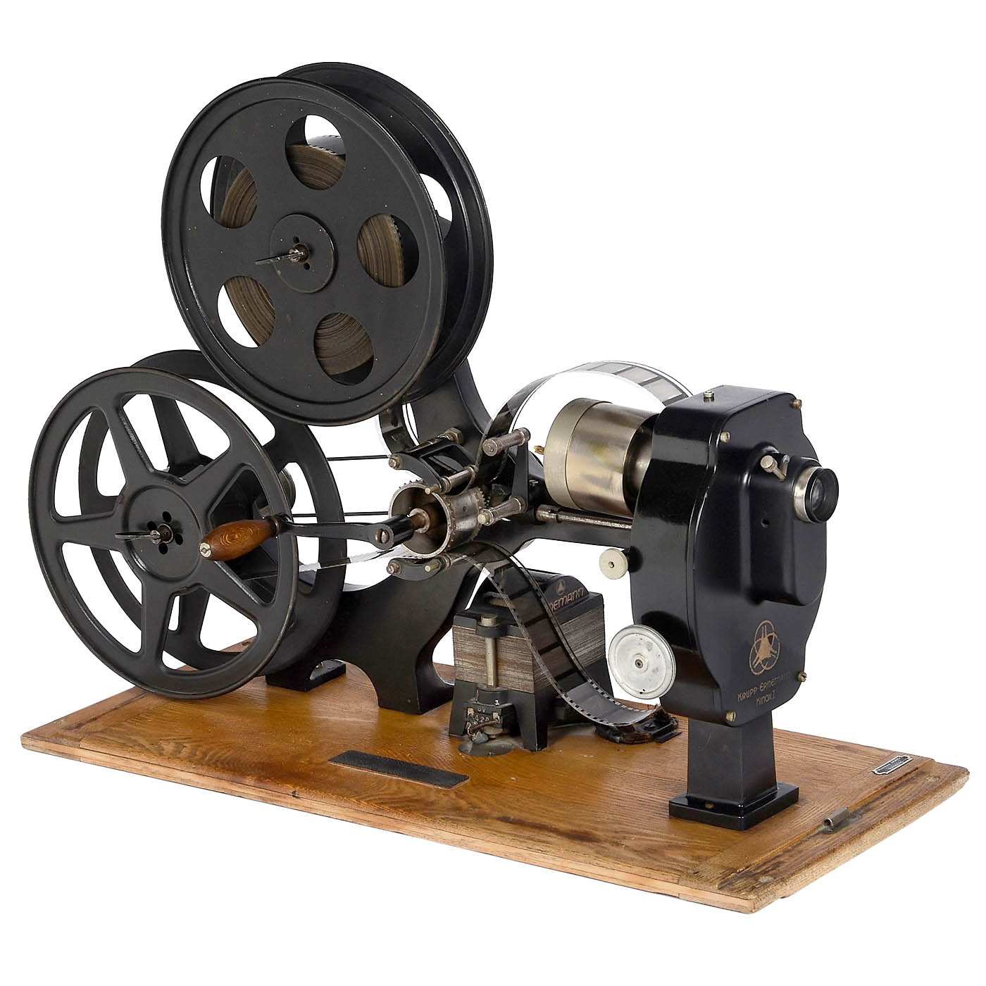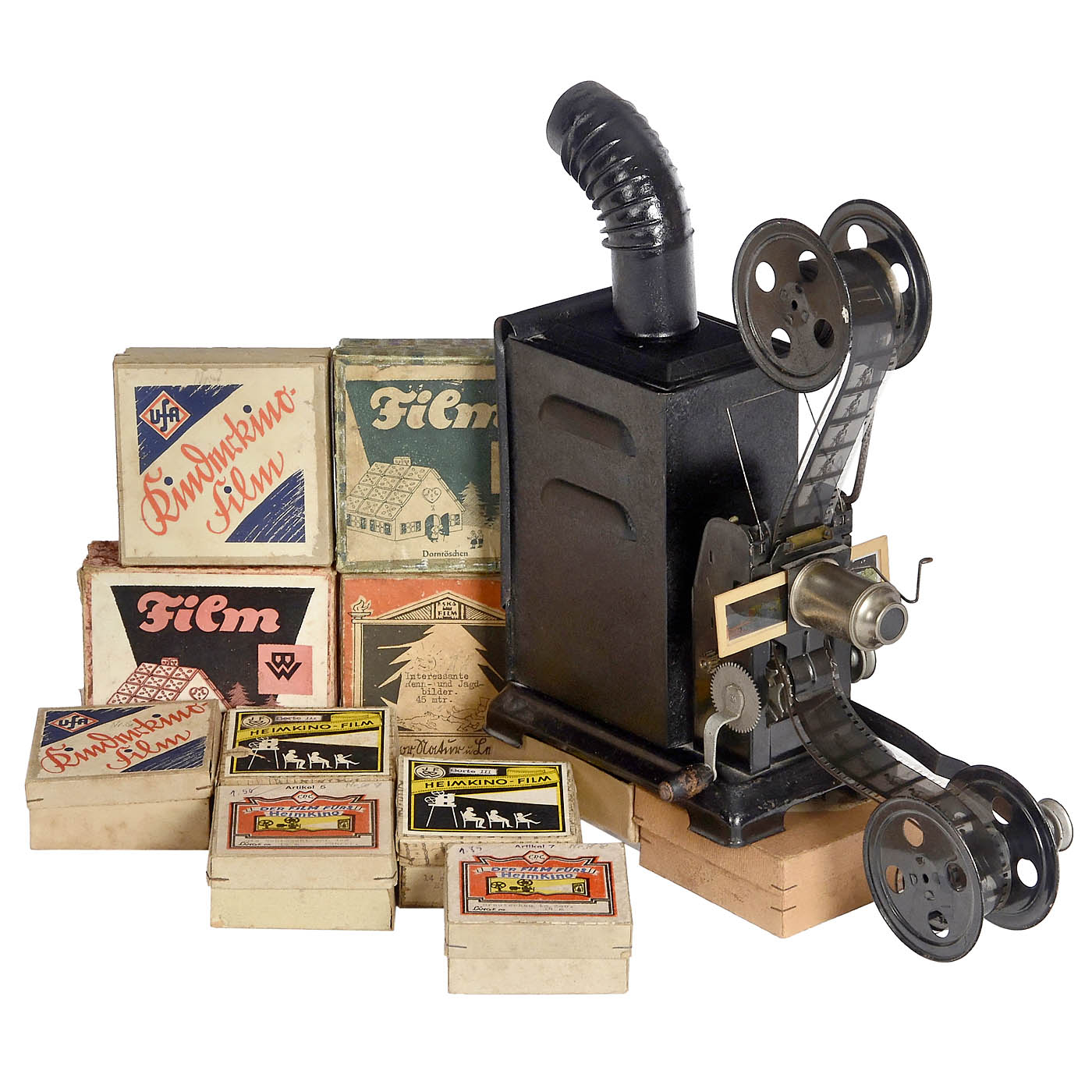 Krupp-Ernemann, Dresden. 1) Kinox I, hand-turned cinematograph for 120-meter reels, with double-claw movement, 70mm lens, low-voltage lamp and integral rewinding mechanism. - 2) Kinox II, cinematograph for 300-meter reels, Maltese cross movement with hand-turned or electric motor, 4.5/105 mm lens and transport box, socket for low-voltage lamp missing. - And: 3) Unmarked children's projector for 35mm films and 30mm slides, with hand-turned Maltese cross movement, electrical function not checked. - In addition: 11 attractive boxes with 35mm films, labeled "UFA Kinderkino", "Heimkinofilm" and others.
