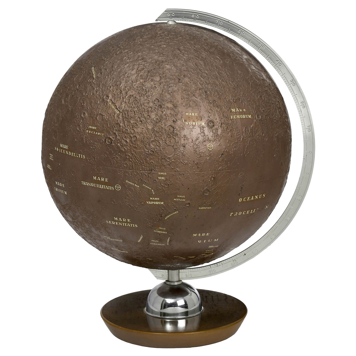 Porcelain engraver Alfred Schlegel, Selb, Germany. Bronze-coloured plastic, Ø 12 ½ in., the side facing the earth depicted in greatest detail (craters, maria and mountains), the reverse sparsely elaborated with a few details (images sent to earth by the Soviet space probe Lunik 3 in 1959), additionally marked with the crash site of the US lunar probe Ranger IV. - Note: This lunar model with its topographical details is a piece of scientific history and a document from the pioneering era of space travel and the space race. Just four years after its completion, it was already obsolete; with the Apollo 8 space mission, the first people saw the far side of the moon with their own eyes. Accurate globes of the entire moon could then be produced.