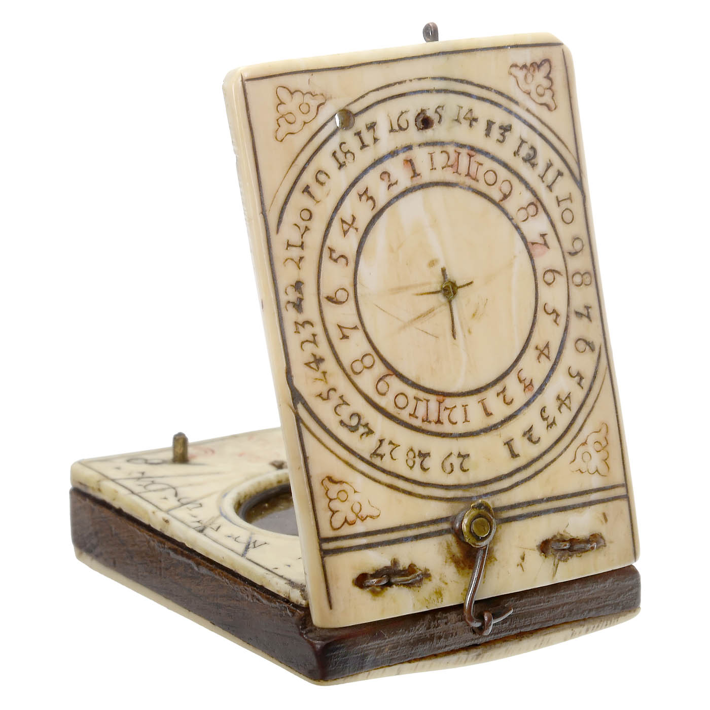 Leonhard Andreas Karner. Consisting of 2 bone plates on a wood core and a bone cover plate, with red-and-black colored engravings, brass hooks, vertical dial on the outside of the lid with calendar 1-29 and hour scales 12-1-12, vertical sundial on the inside of the lid with Roman numerals VI-XII-VI and half-hour dots, thread gnomon missing, baseplate with Arabic numerals 4-12-8, inset compass with the four cardinal points: SEPT-ORIE-MERI-OCCI, underside with small engraved master's mark "Hand", dimensions closed only 1 1/3 x 2 x ½ in.