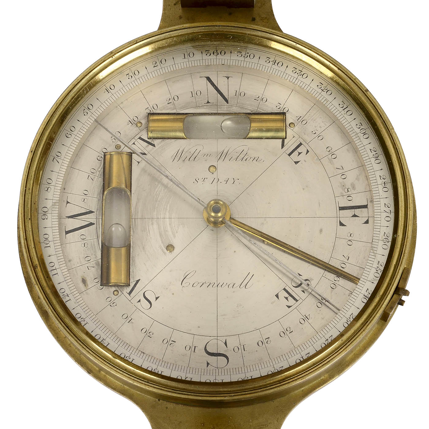 1) Full-circle instrument (circumferentor), c. 1850, signed on the silver-plated compass "Will'm Wilton, St. Day, Cornwall", with 2 sights and lid, Ø 5 in. - And: 2) Dutch circumferentor, signed "Gebroeder Bayens, Delft", c. 1820, compass with silver-plated scale, with 4 sights, Ø 7 ¼ in.