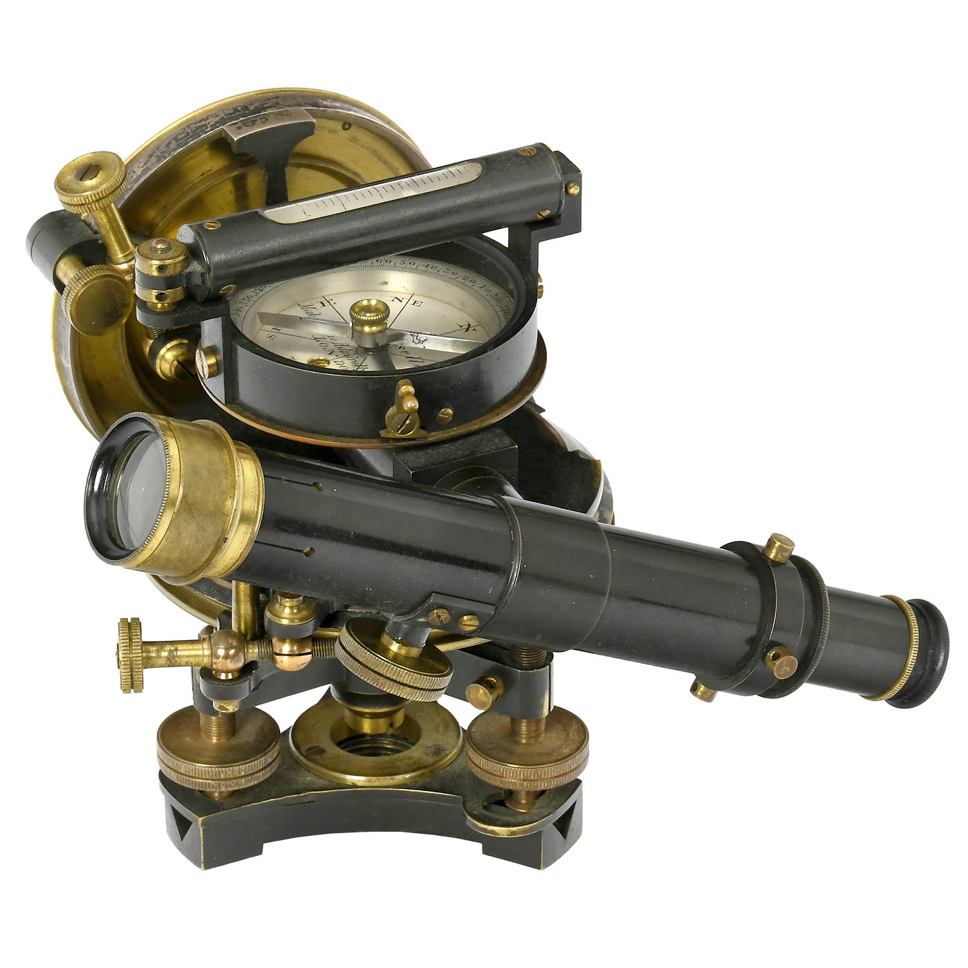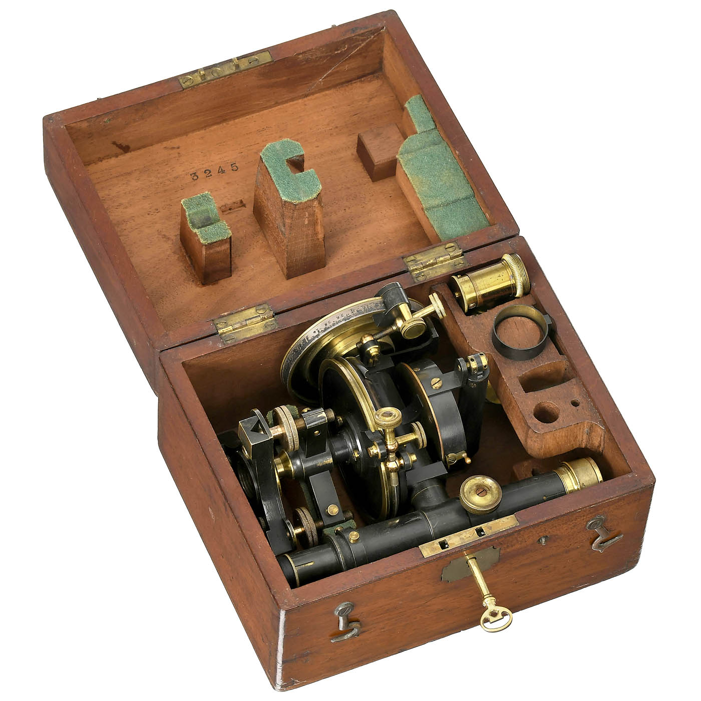 L. Casella Maker to the Admiralty Ordnance London, no. 3.245, original blackened and lacquered brass, compass, Ø 2 in., silver-plated horizontal and vertical 360° graduation with verniers, telescope with rack-and-pinion focussing, length 6 in., on adjustable tripod stand, with 2 further parts in matching mahogany case.