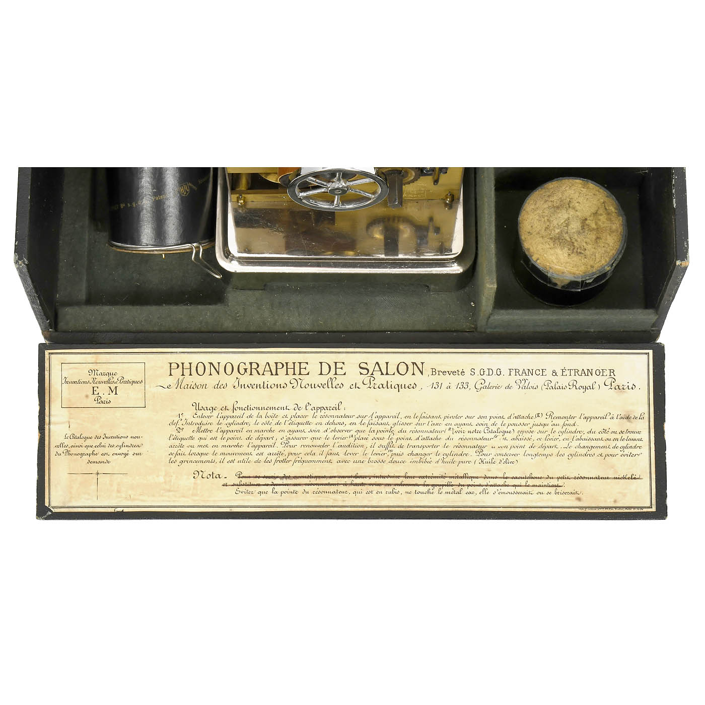 Model No. 2, no. 1032, invented and manufactured by Parisian clockmaker Henri Lioret (1848-1938), with nickel-plated brass case with signature, spring motor, original reproducer, horn, key and box with instructions on the front flap, good original playing condition. Included are three celluloid cylinders.